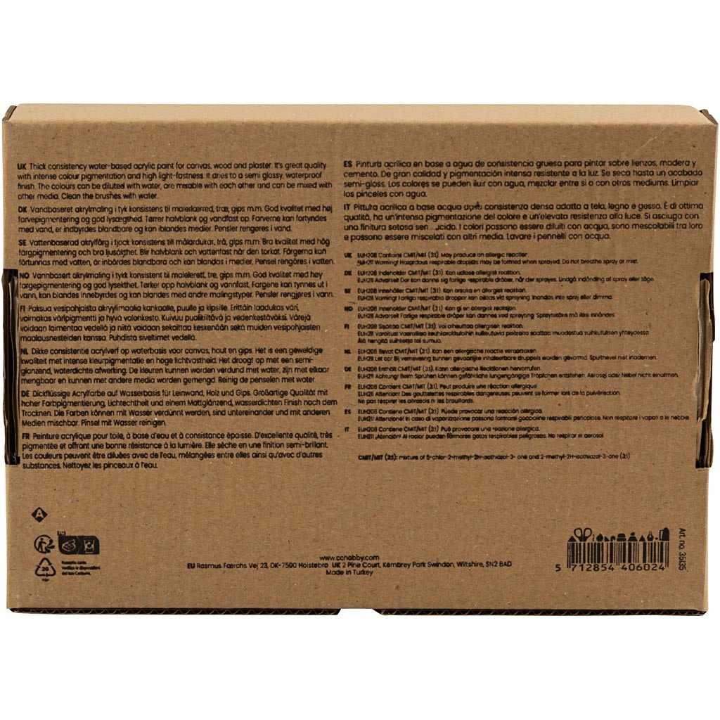 De Acryl Verf set van Creativ Company uit de Color School lijn biedt veelzijdige creatieve mogelijkheden. Deze doos bevat vijf tubes van 75 ml in verschillende kleuren: MarsBlackPigmA, CadmiumRedPigmA, CyanBluePigmA, PrimaryYellowPigmA en TitaniumWhitePigmA. De semi-glanzende afwerking zorgt voor een subtiele glans, waardoor kunstwerken een levendige uitstraling krijgen zonder te overheersen.