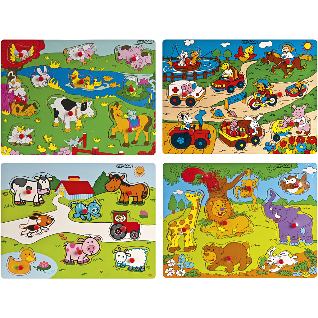 De VIGA puzzelset bestaat uit vier stuks in een handige doos en is ideaal voor gebruik op school of thuis. Elke puzzel heeft een afmeting van 22,5 x 30 cm en bestaat uit 8 tot 10 delen, waardoor ze perfect zijn voor kinderen die beginnen met puzzelen. De heldere kleuren en grote stukken maken de puzzels aantrekkelijk en makkelijk hanteerbaar voor jonge kinderen.