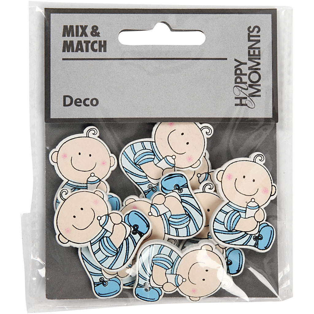 Gebruik ze bijvoorbeeld als decoratief accent op geboortekaartjes, scrapbooks of cadeauverpakkingen. De natuurlijke uitstraling van het hout in combinatie met de lichtblauwe tint zorgt voor een subtiele, speelse afwerking. Met een beetje hobbylijm bevestig je de figuurtjes eenvoudig op diverse ondergronden, wat het knutselen nog makkelijker maakt.