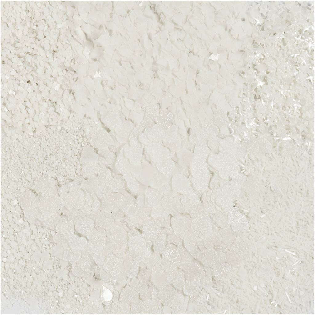 De glitters en pailletten zijn ideaal voor het versieren van kaarten, cadeauverpakkingen, knutselprojecten of feestdecoraties. De neutrale en feestelijke kleuren zilver en wit passen bij allerlei thema’s en stijlen, van winterse decoraties tot elegante accenten bij bruiloften. Voor het beste resultaat kun je een dun laagje lijm aanbrengen op het oppervlak en daarna de sparkles en sequins voorzichtig strooien of plaatsen voor een gelijkmatig effect.