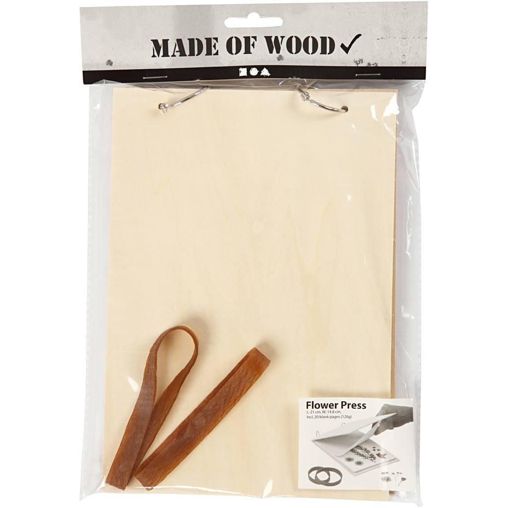 Bloemenpers met licht houten kaft met hersluitbare metalen ringen en 20 blanco pagina's (120 gr). Twee brede elastische banden zijn inbegrepen, die rond de hoes zijn geplaatst voor extra druk