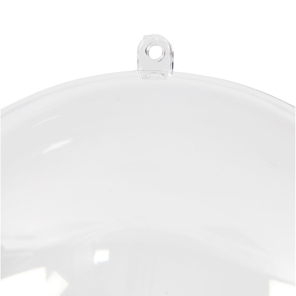 Tweedelige, hangende ballen van plastic om te decoreren met verf of te vullen met kleine dingetjes. Losse kartonnen inleg om te decoreren