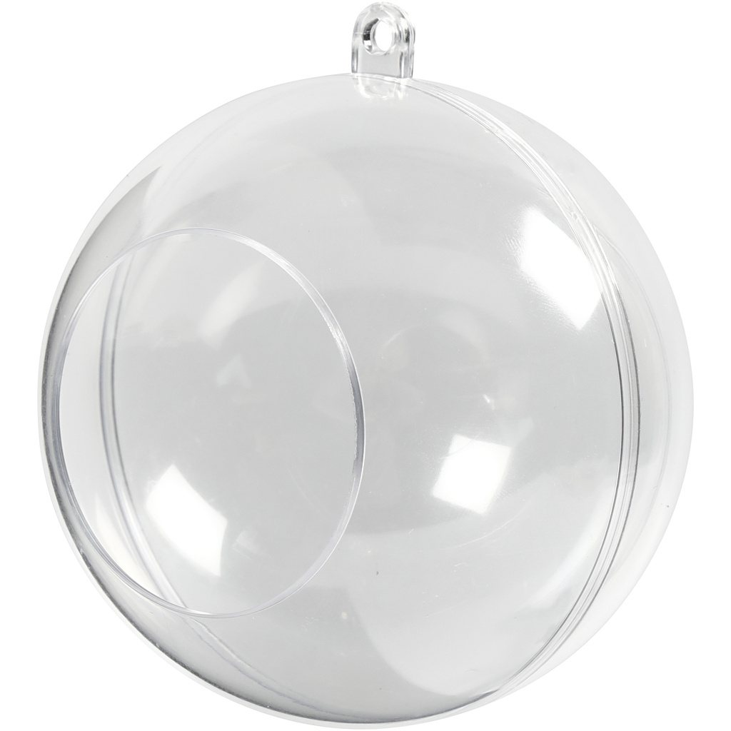 Tweedelige, transparante, gladde ballen van plastic met ophangoog en opening aan de voorzijde. Lees meer