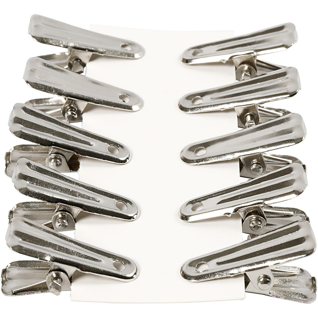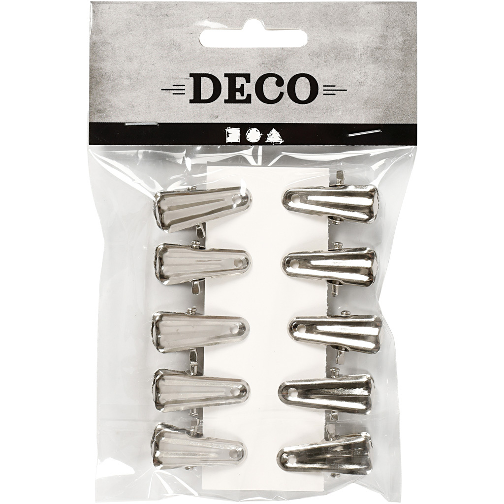 De Deco knijpers van Creativ Company zijn praktische metalen knijpers in een stijlvolle zilveren kleur. Met een lengte van 27 mm en een breedte van 14 mm zijn deze knijpers compact en veelzijdig in gebruik. Ze worden per 10 stuks geleverd in een handige doos, waardoor je altijd voldoende knijpers bij de hand hebt voor verschillende projecten.
