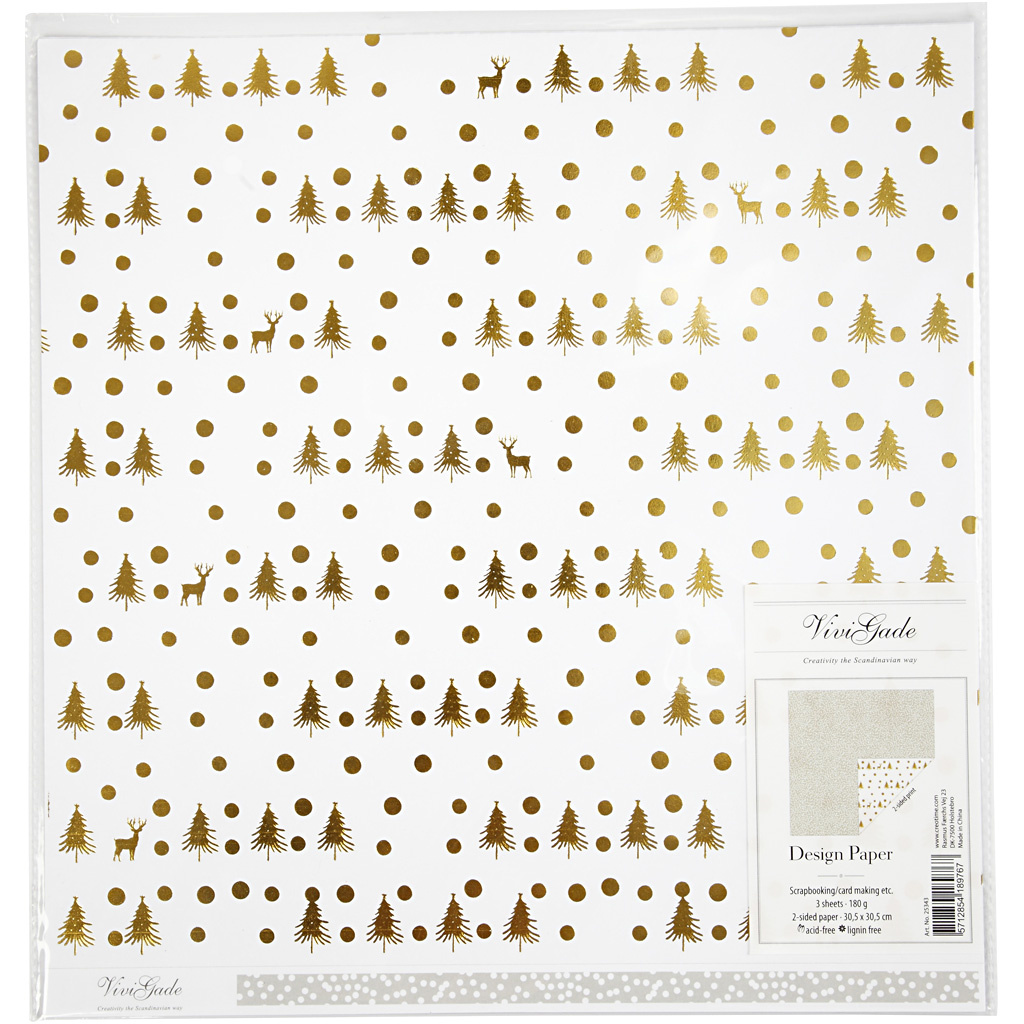 Vivi Gade Design papier, herten en stippen, vel 30,5x30,5 cm, 180 gr, goud, 3 vel/ 1 doos