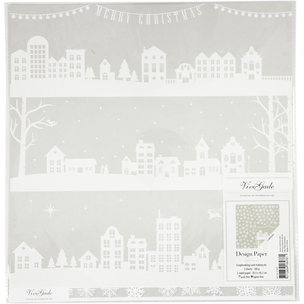 Vivi Gade Design papier, huizen en sneeuwvlokken, vel 30,5x30,5 cm, 180 gr, 3 vel/ 1 doos