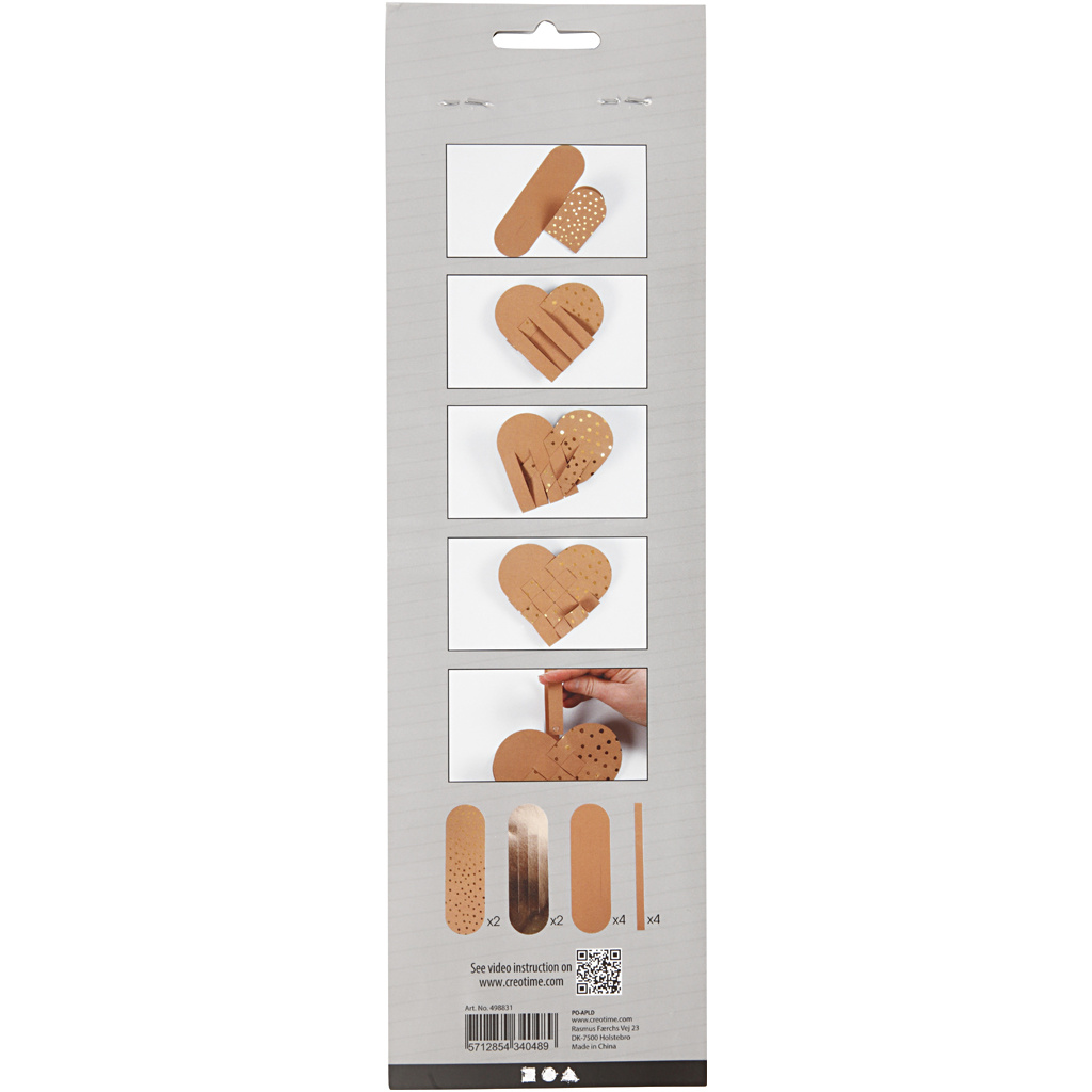Materialenset met uitgestanste delen voor 4 gevlochten harten in 3 designs, Inclusief natuurlijke hengsels. Inhoud: sjabloon voor 2 harten van natuur, 1 hart in goud en 1 hart van natuur met goudfolie en 4 hengsels Inclusief instructie