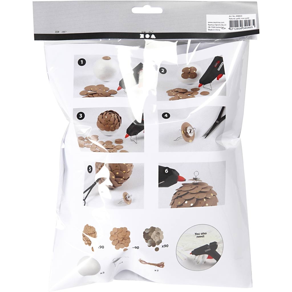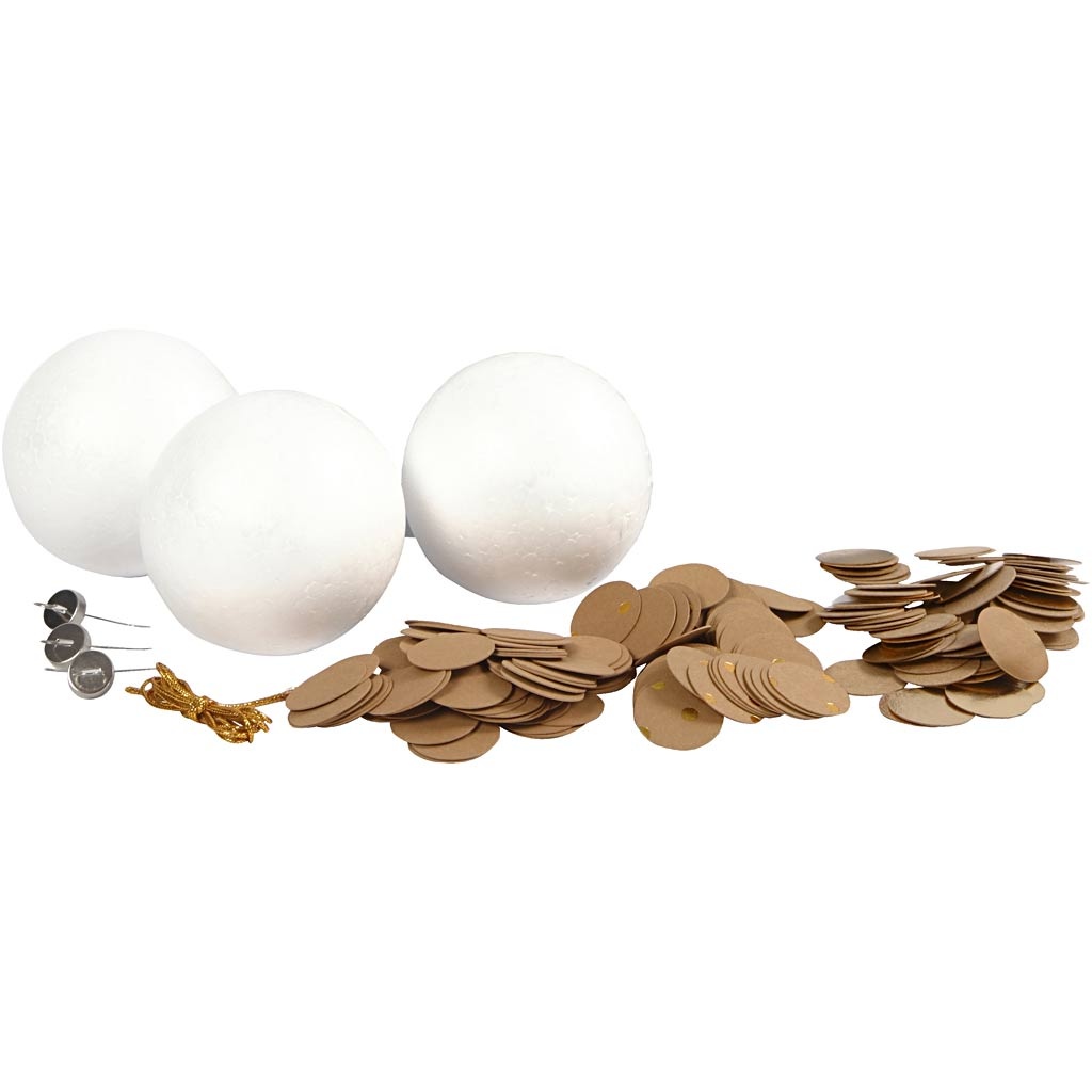 Materialenset met uitgestanste cirkels, die op ballen van styropor gelijmd worden met een lijmpistool. Inhoud: 3 ballen van styropor, 3x90 cirkels, 1m koord, 3 hangers. Inclusief instructie