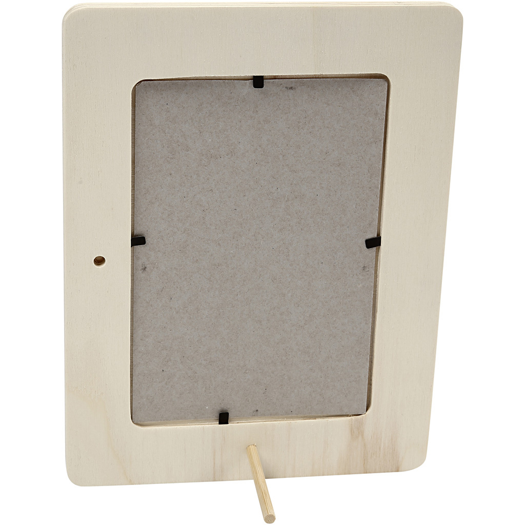 Lijst van licht hout met brede rand en metalen ophangoog voor het verticaal of horizontaal monteren en stokjes zodat de lijst kan staan