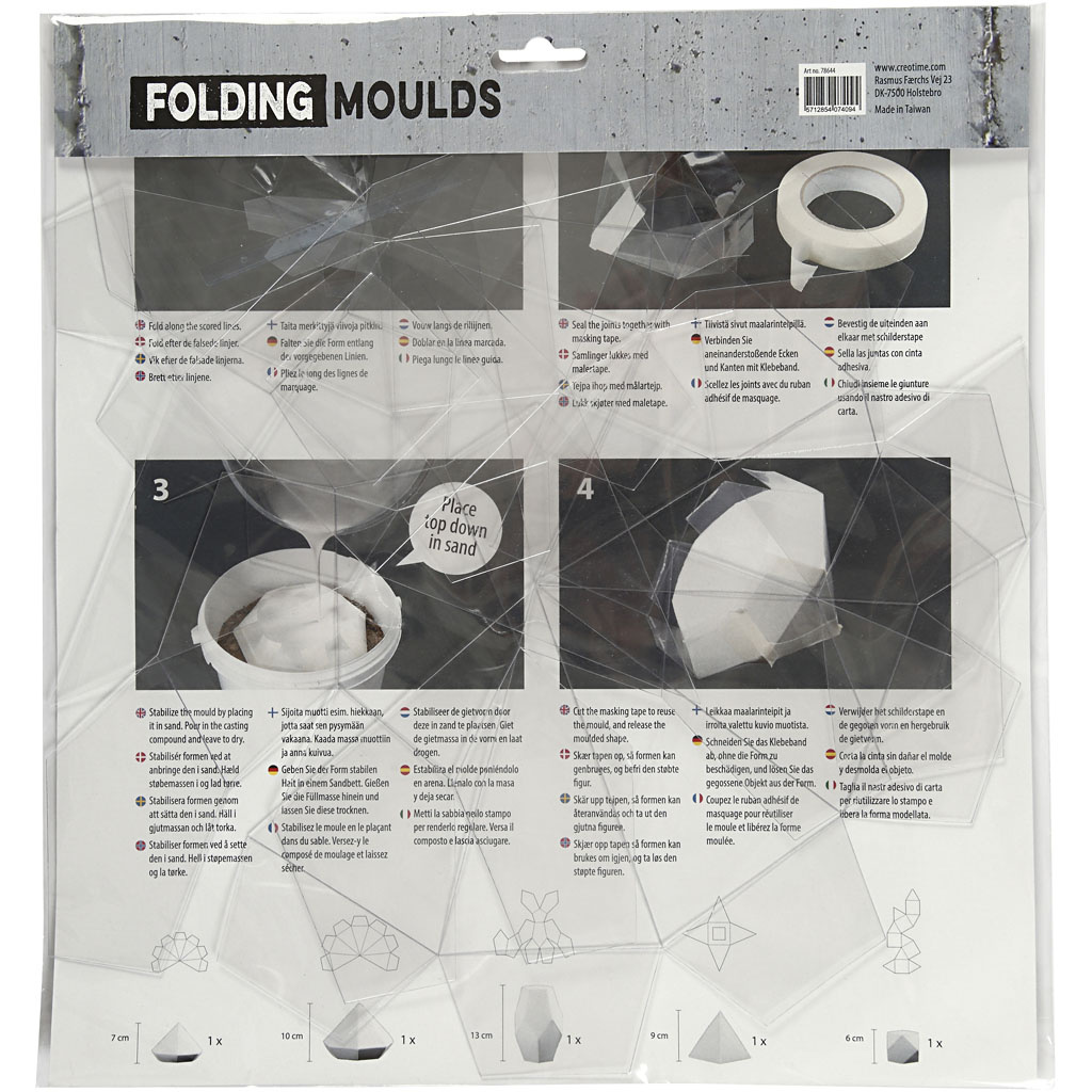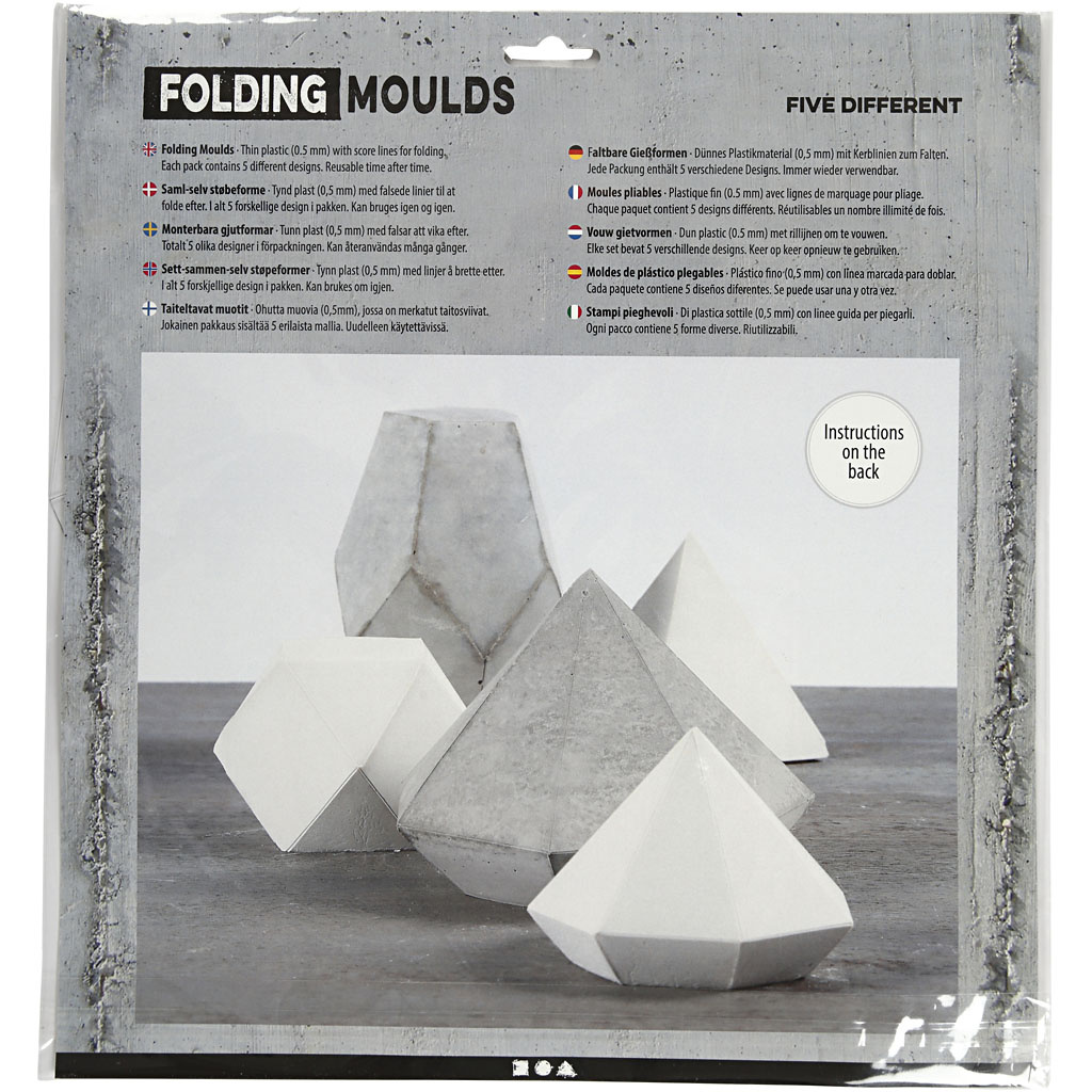 Set van 5 zelf in elkaar te zetten vormen van dun plastic met vouwlijnen. Makkelijk in elkaar te zetten met bijv. schilderstape. Na gebruik schoonmaken en opnieuw te gebruiken. Pak met 5 verschillende designs. Beste resultaat wordt bereikt door het laten harden van het beton in de vorm