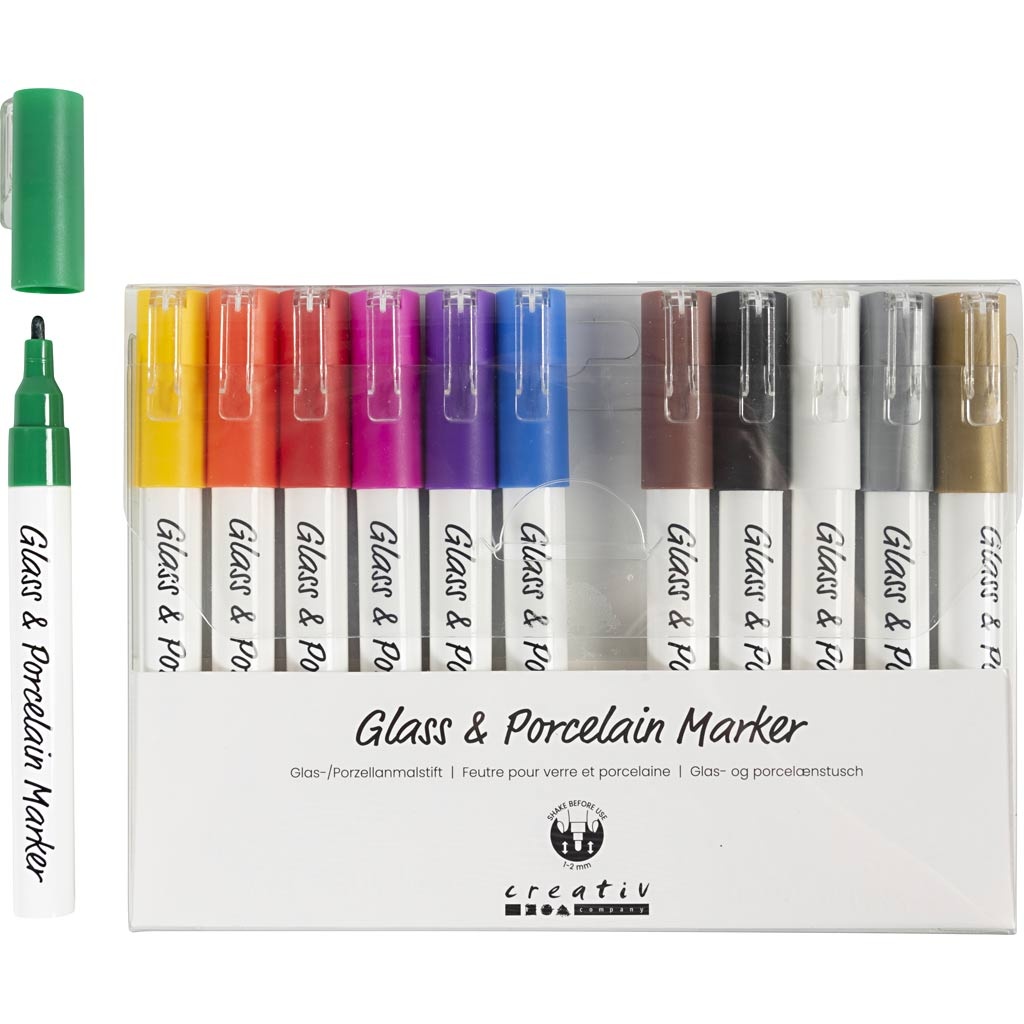 Creativ Company Glas- & Porseleinstiften, lijndikte 1-2 mm, semi-dekkend, diverse kleuren, 12 stuk/ 1 doos