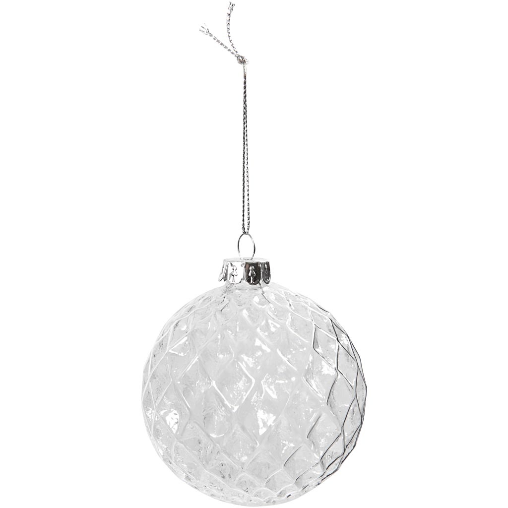 Bal van transparant glas met facet harlekijn patroon. Voorzien van een metalen kraag met oog om aan op te hangen - inclusief zilverkleurig koord. Geleverd in een zwarte cadeaudoos met transparant deksel