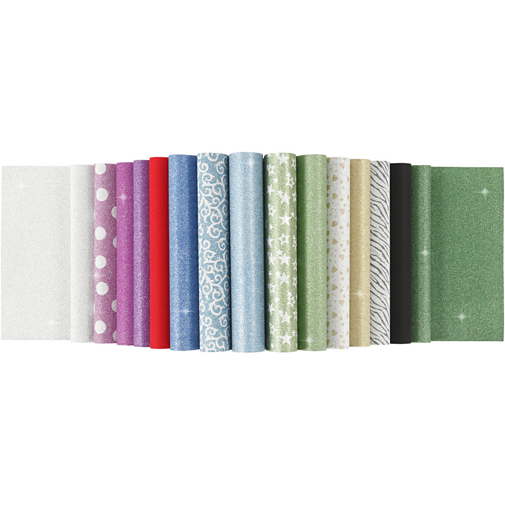 Serie mat papier aan één kant bedrukt met glitterlak. Totaal 10 unikleurige vellen en 5 vellen met patroon van elk 2 stuks.