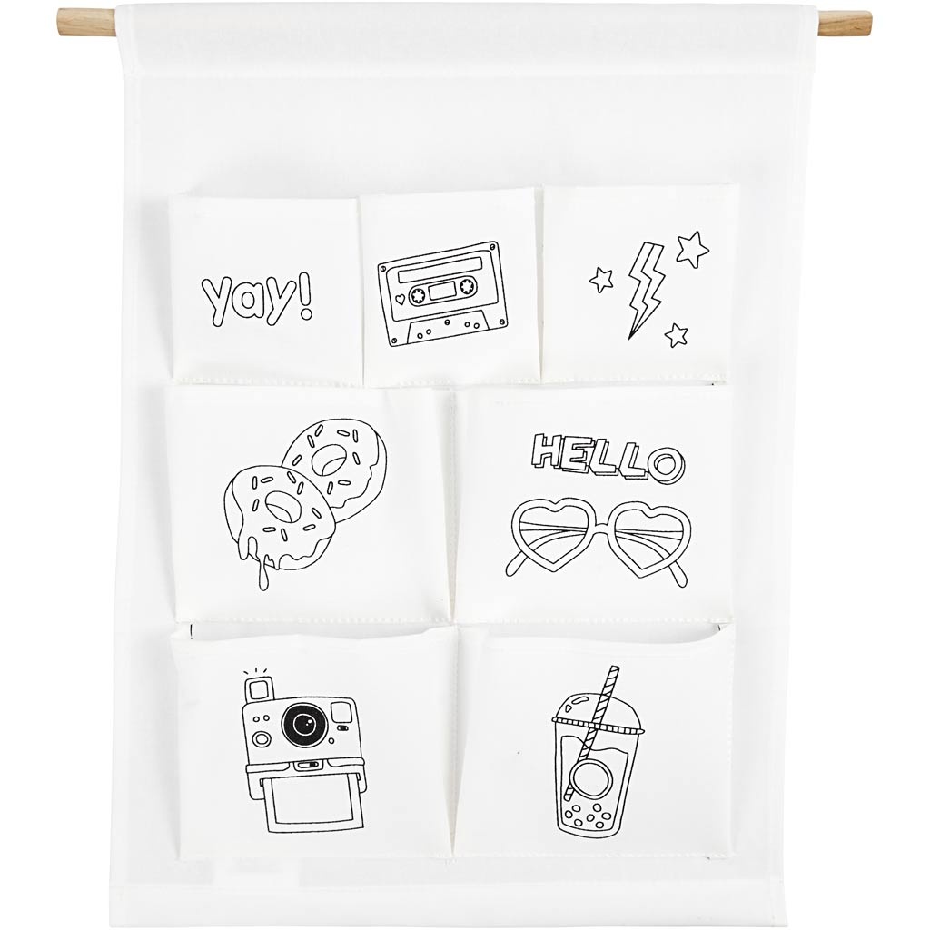Wees creatief en personaliseer deze praktische organizer op kleurrijke wijze, met aantrekkelijke voorgedrukte motieven. Gebruik je favoriete gekleurde textielstiften, textielverf etc. Hangende organizer in stevig canvas met plastic achterkant en een tunnel aan de bovenkant met houten plug om op te hangen. Ideaal om kleine spullen in op te bergen