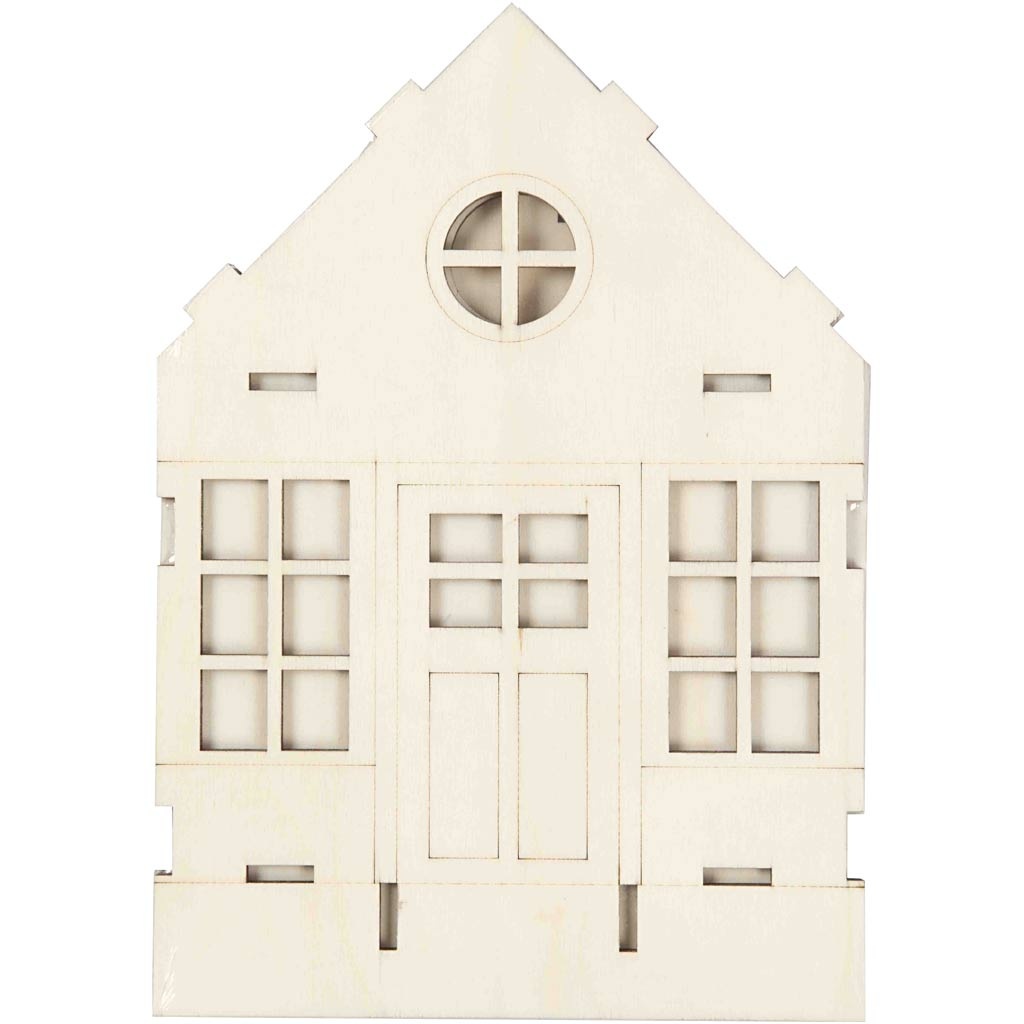 DIY huis van licht hout om zelf in elkaar te zetten met contouren om de ramen en de deur. De achterkant van het huis kan makkelijk los gemaakt worden, zodat het huis eenvoudig aan de binnenkant gedecoreerd kan worden