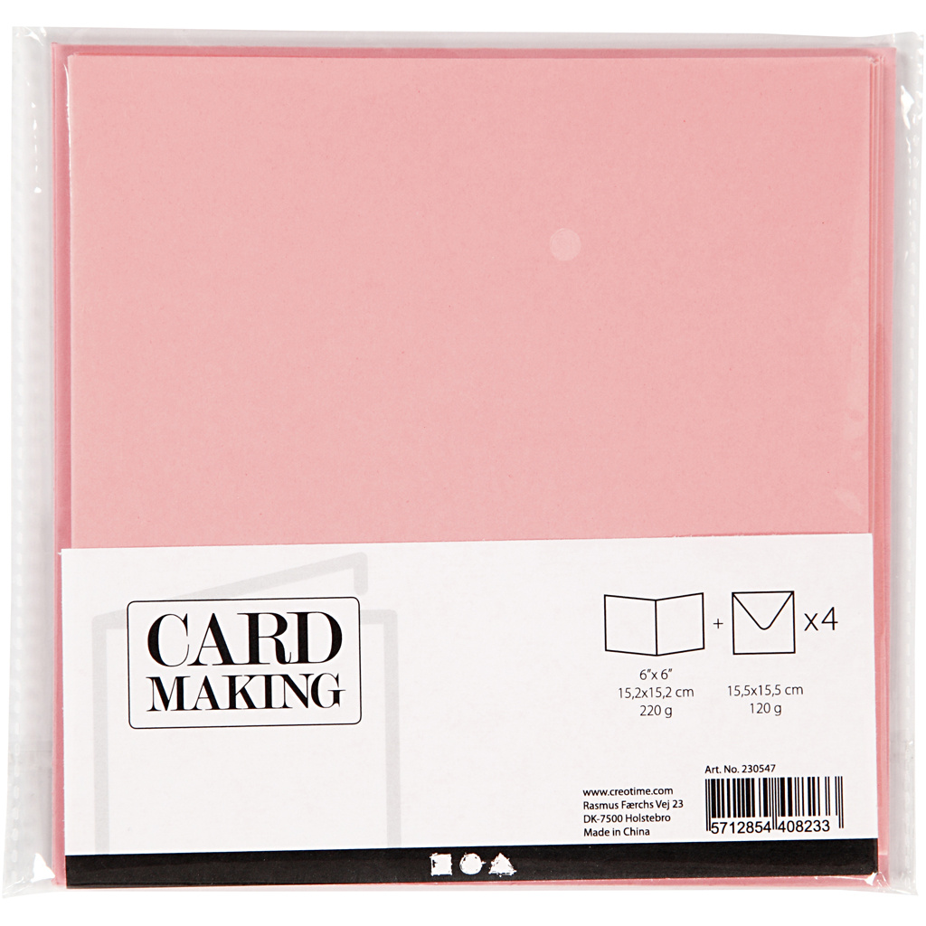 Kaarten en enveloppen, afmeting kaart 15,2x15,2 cm, afmeting envelop 16x16 cm, 220 gr, roze, 4 set/ 1 doos