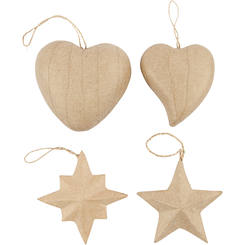 Assortiment handgemaakte kerstvormen van papier-maché, sterren en harten, met ophanglus van jute en kern van plastic om stabiliteit te verzekeren Set bevat 3 verschillende designs. Geleverd in een grote displaydoos van papier-maché afmetingen 37x37x12 cm