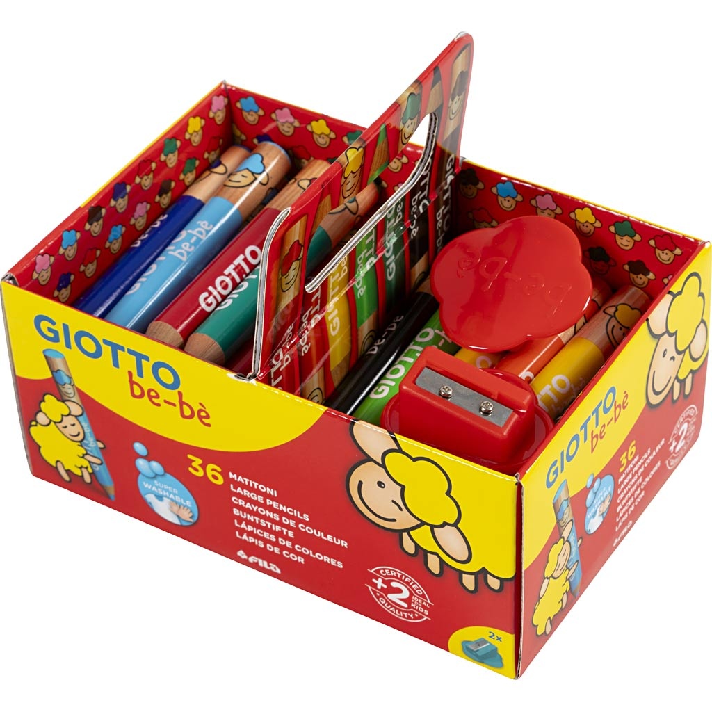 Zeer kindvriendelijke, korte, dikke potloden van Giotto Be-bè en 1 puntenslijper. Ontwikkeld en goedgekeurd voor kinderen vanaf 2 jaar Lees meer