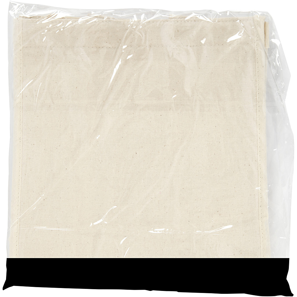 Kleine koeltas met hengsels en rits. De buitenkant en de zak zijn van katoen (220 g/m²) en kunnen worden gedecoreerd met bijvoorbeeld textielstiften of textielverf. De binnenkant is bekleed met isolerend folie