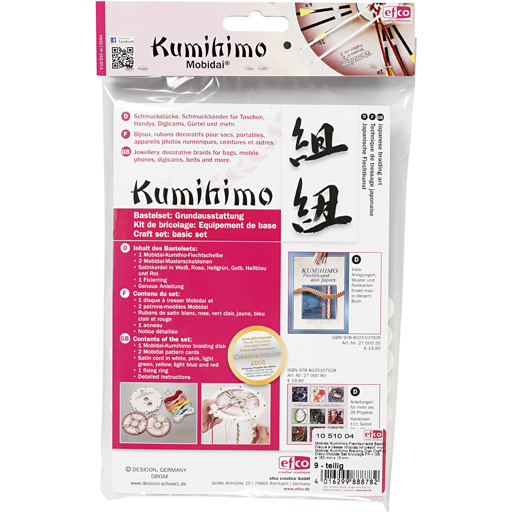 Deze set bevat 1 Mobidai vlechtschijf, 2 patroonkaarten en satijnkoord in 6 verschillende kleuren van elk 3 m. Super activiteit voor iedereen die houdt van vlechten