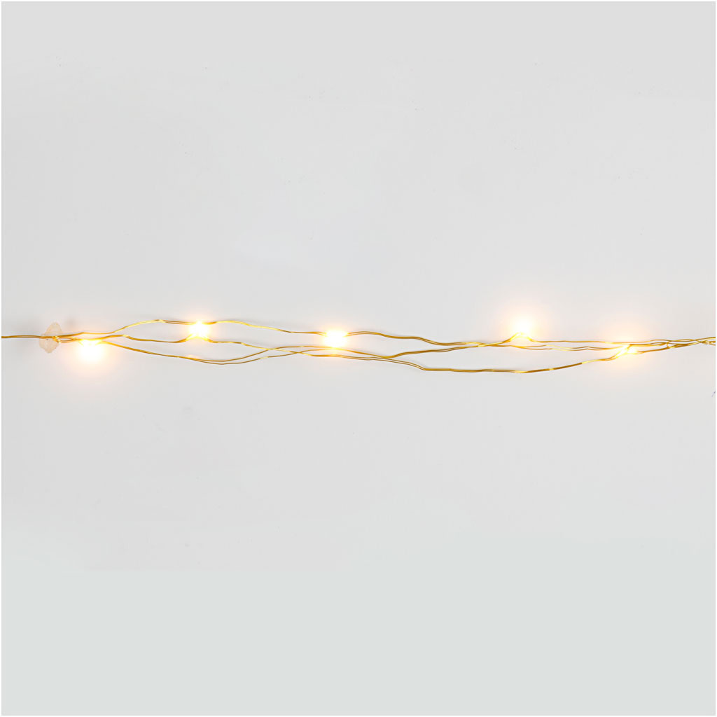 Slinger met 20 kleine LED lampjes op batterijen. Dubbele draad met koperdraad met kleine diodes ertussen gelijmd. 2x AA batterijen benodigd, bijvoorbeeld artikelnr. 14000 (niet inclusief). Alleen voor gebruik binnenshuis