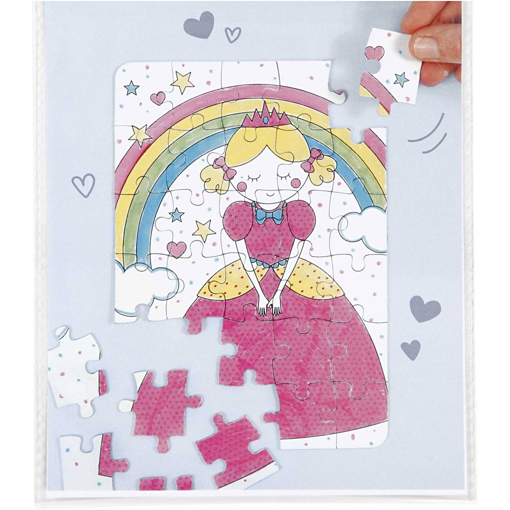 Materialenset met puzzel van wit karton met voorgedrukte motieven om te decoreren met stiften. Inclusief inspiratie Inhoud: 1 voorbedrukte puzzel en 4 mini stiften