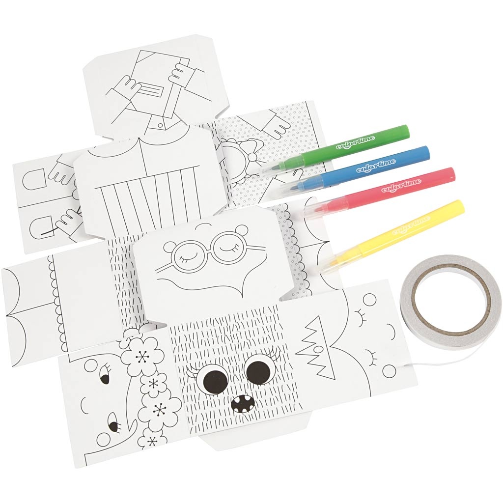 Materialenset met stabiele blokken van stevig karton met voorgedrukte motieven om te decoreren met stiften. Inclusief inspiratie. Inhoud: 3 vellen met voorbedrukt karton, 4 mini stiften en dubbelzijdig klevend tape