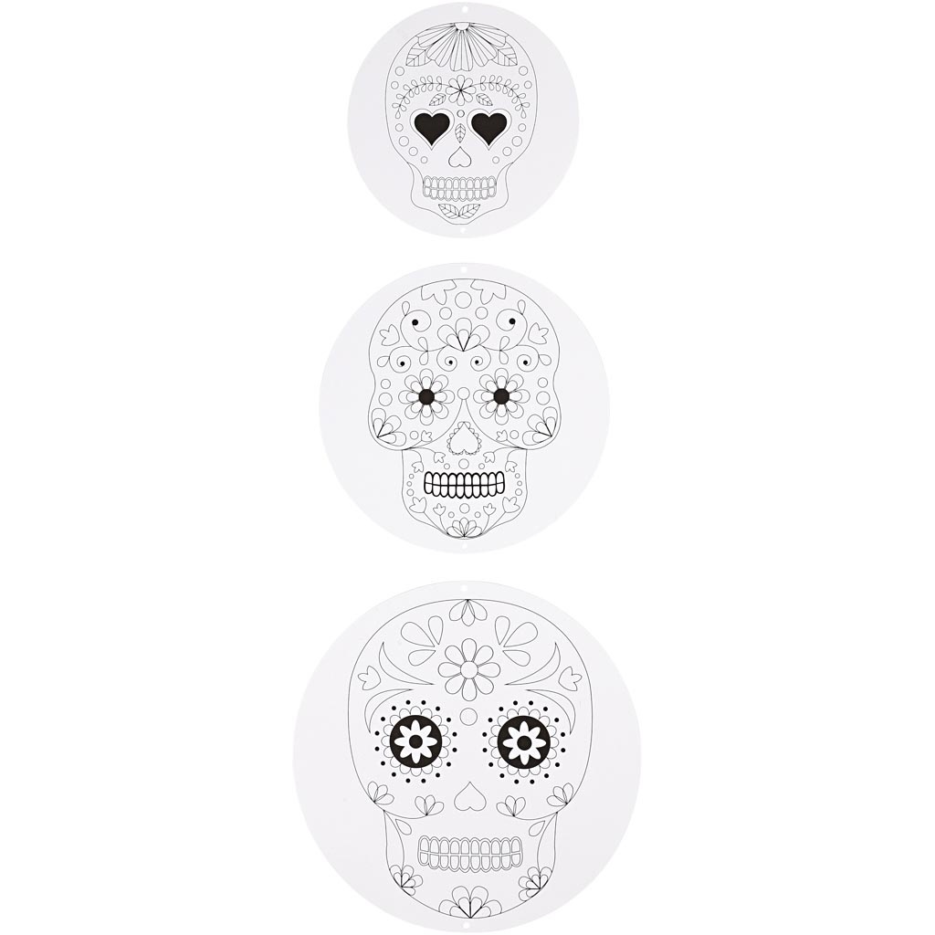 Rond, dik karton (300 gr) in 3 maten met gedetailleerd motief in het zwart aan beide kanten. Allen met gat aan de boven- en onderkant voor het monteren met bijgeleverde swivels