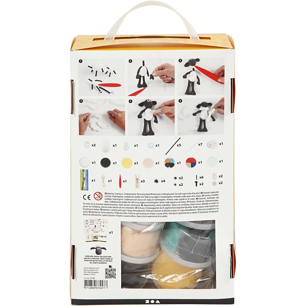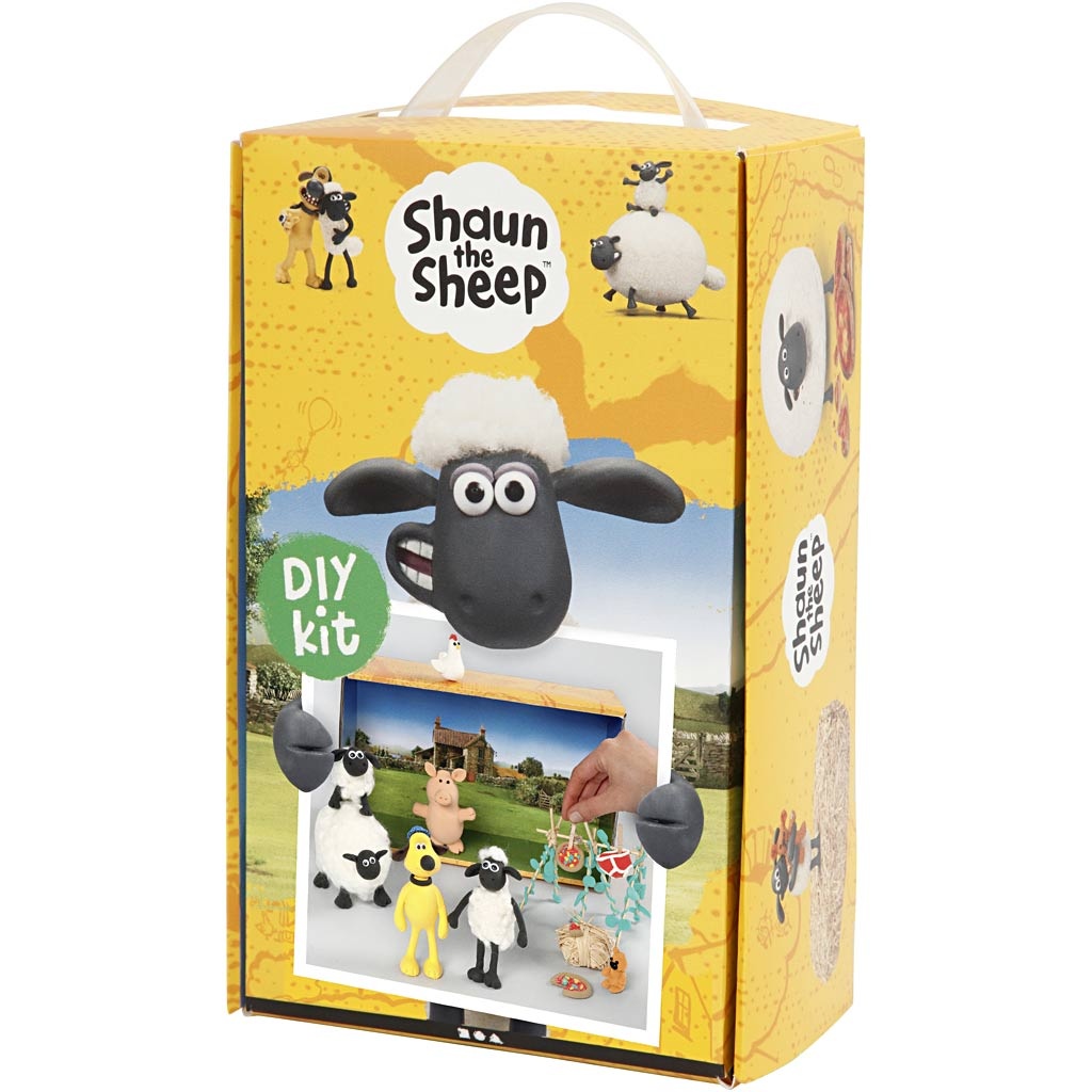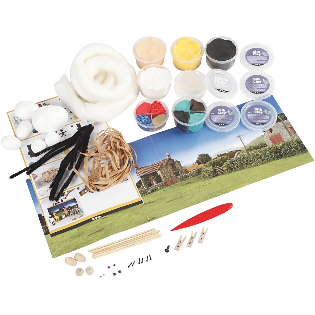 Materialenset met veel verschillende creatieve materialen voor het modelleren van Shaun, Bitzer, Timmy en andere populaire Shaun het Schaap personages in Silk Clay en Foam Clay. Gebruik de meegeleverde doos als Shaun het Schaap omgeving van dieren