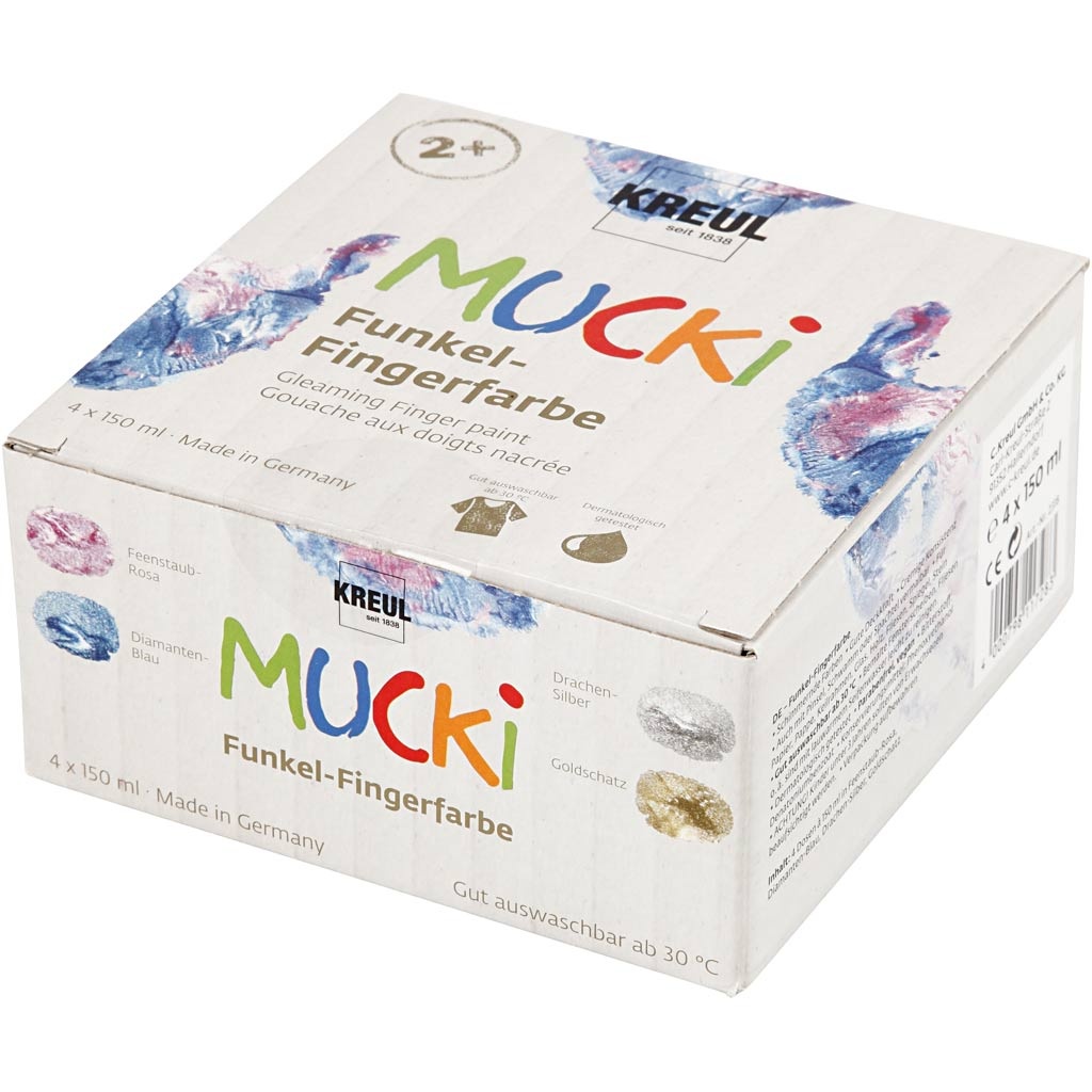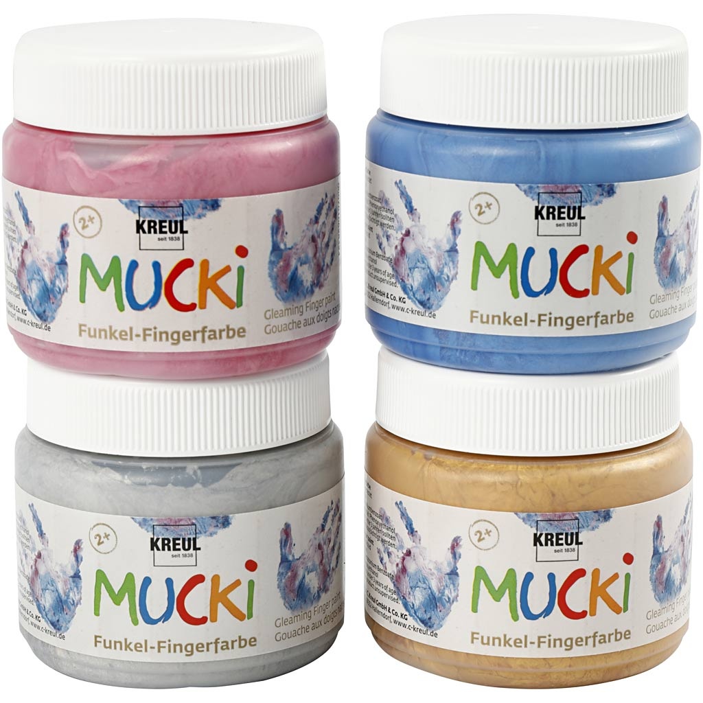 Kreul Mucki Vingerverf, metallic blauw, goud metallic, metallic roze, zilver metallic, 4x150 ml/ 1 doos