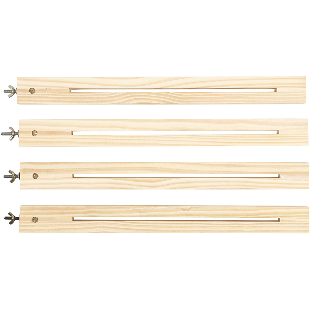 Lijst bestaande uit 4 stokken voor het zelf maken van vierkante of rechthoekige afmetingen. Elke stok heeft lange sleuf en is aan het einde voorzien van draad en schroef in metaal. Ongemonteerd geleverd, inclusief instructies