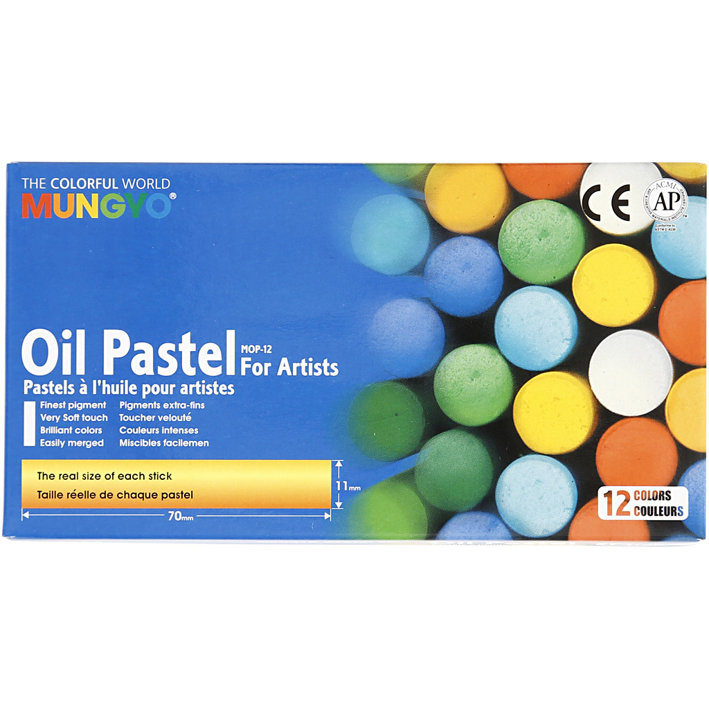 De Mungyo Oliepastel set bestaat uit twaalf heldere pastels in diverse kleuren, geleverd in een compacte doos. Deze oliepastels van Mungyo zijn elk 7 cm lang en hebben een dikte van 11 mm, waardoor ze prettig in de hand liggen en geschikt zijn voor zowel gedetailleerd werk als het vullen van grotere oppervlakken. De veelzijdige kleurencombinatie maakt deze set geschikt voor uiteenlopende creatieve projecten, van landschappen tot portretten.