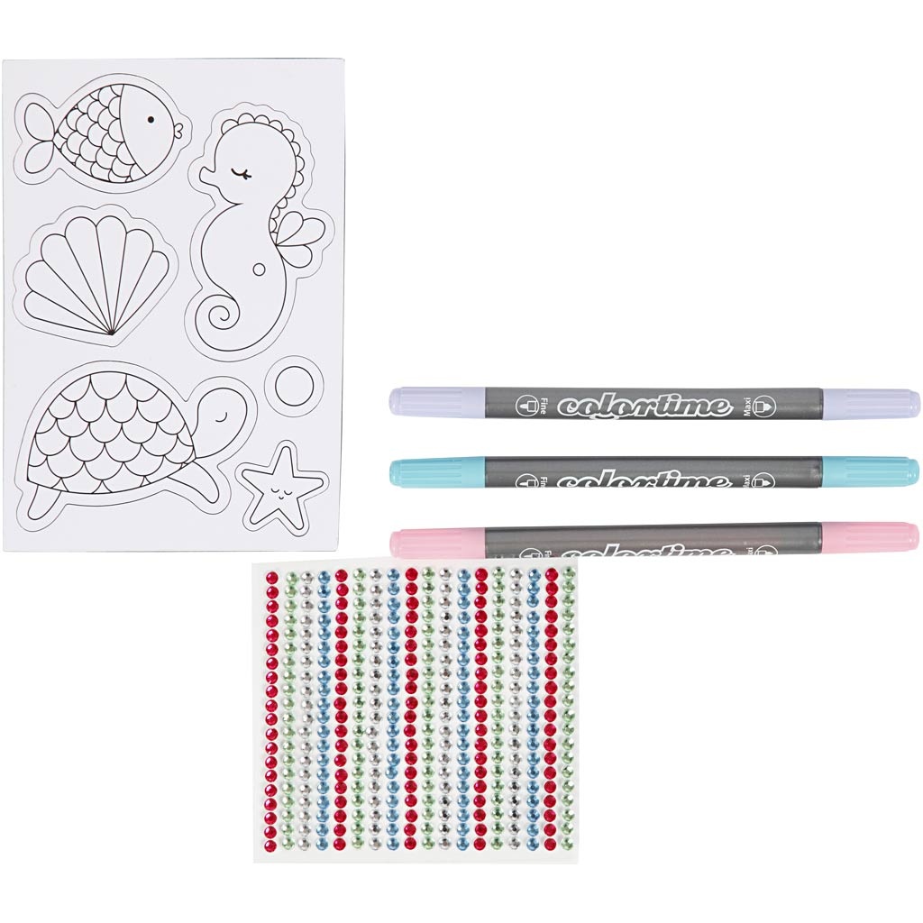 Materialenset met materialen voor het decoreren van magneten met voorbgedrukt motief. Inclusief inspiratie Inhoud: 1 vel met 6 magneten, 3 Colortime stiften en 1 vel strasstenen