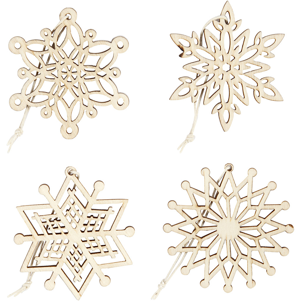 Ornamenten van licht hout met donkere randen en ophangkoord