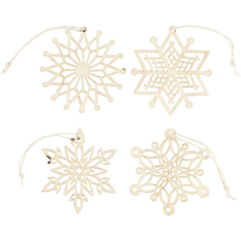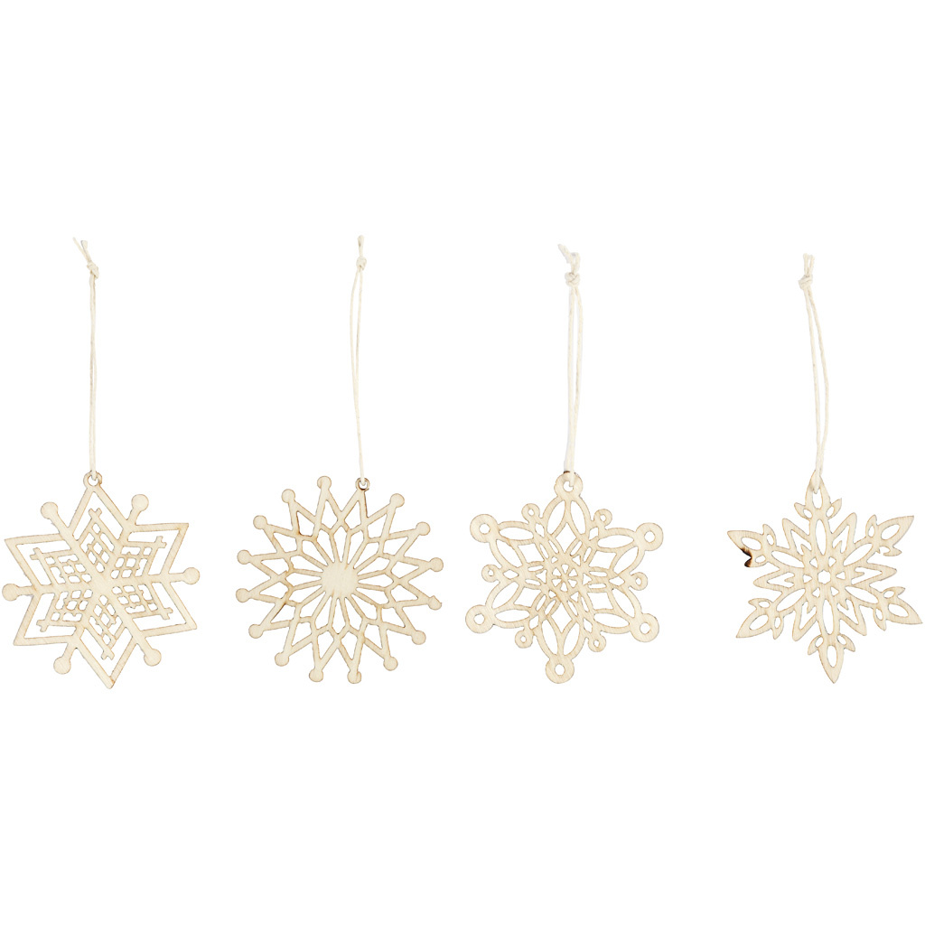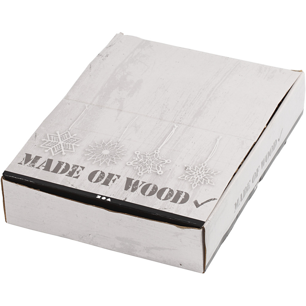 Ornamenten van licht hout met donkere randen en ophangkoord Lees meer