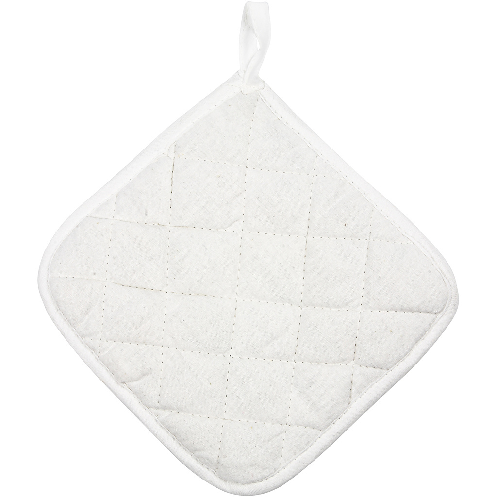 Vierkante, gewatteerde pannenlappen van 100% katoen met ophanglus. Aan één zijde doogestikt.