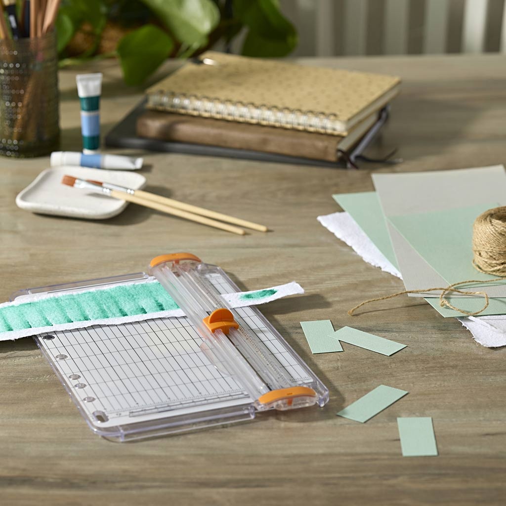 Draagbare papiersnijder van Fiskars met aluminium oppervlak en praktische hulplijnen Lees meer