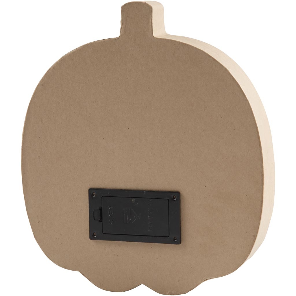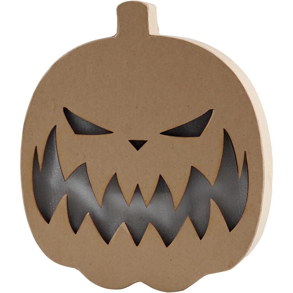 Platte pompoen van papier-maché met een gezicht met een licht op batterijen. Kan zelfstandig staan, beschikt over een ingebouwde ruimte voor batterijen en een aan/uit schakelaar aan de zijkant Geeft een warm licht door de openingen die bedekt zij Geeft een warm licht door de openingen die bedekt zijn met transparante stof. Werkt op 2x AA batterijen - 14000 (niet meegeleverd)