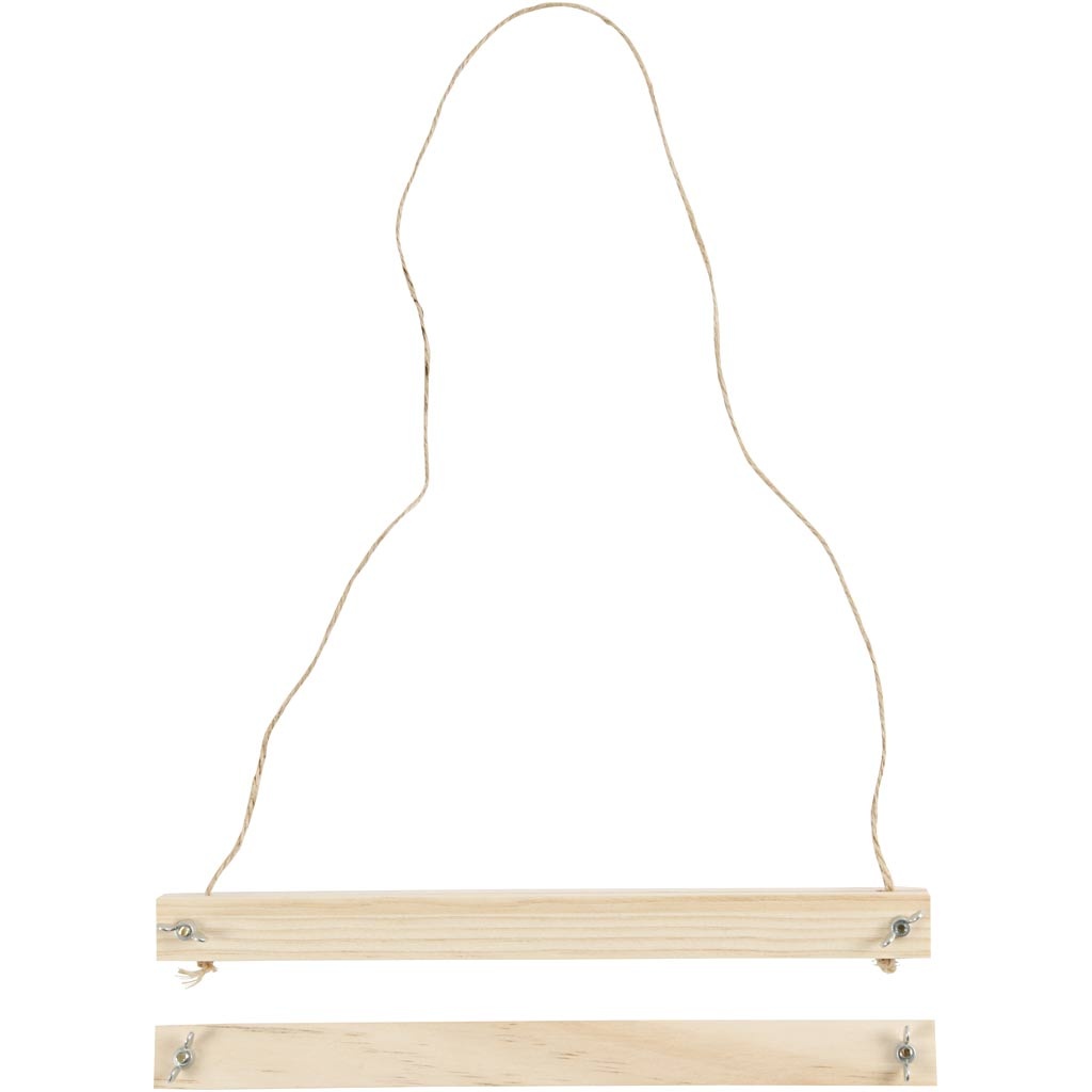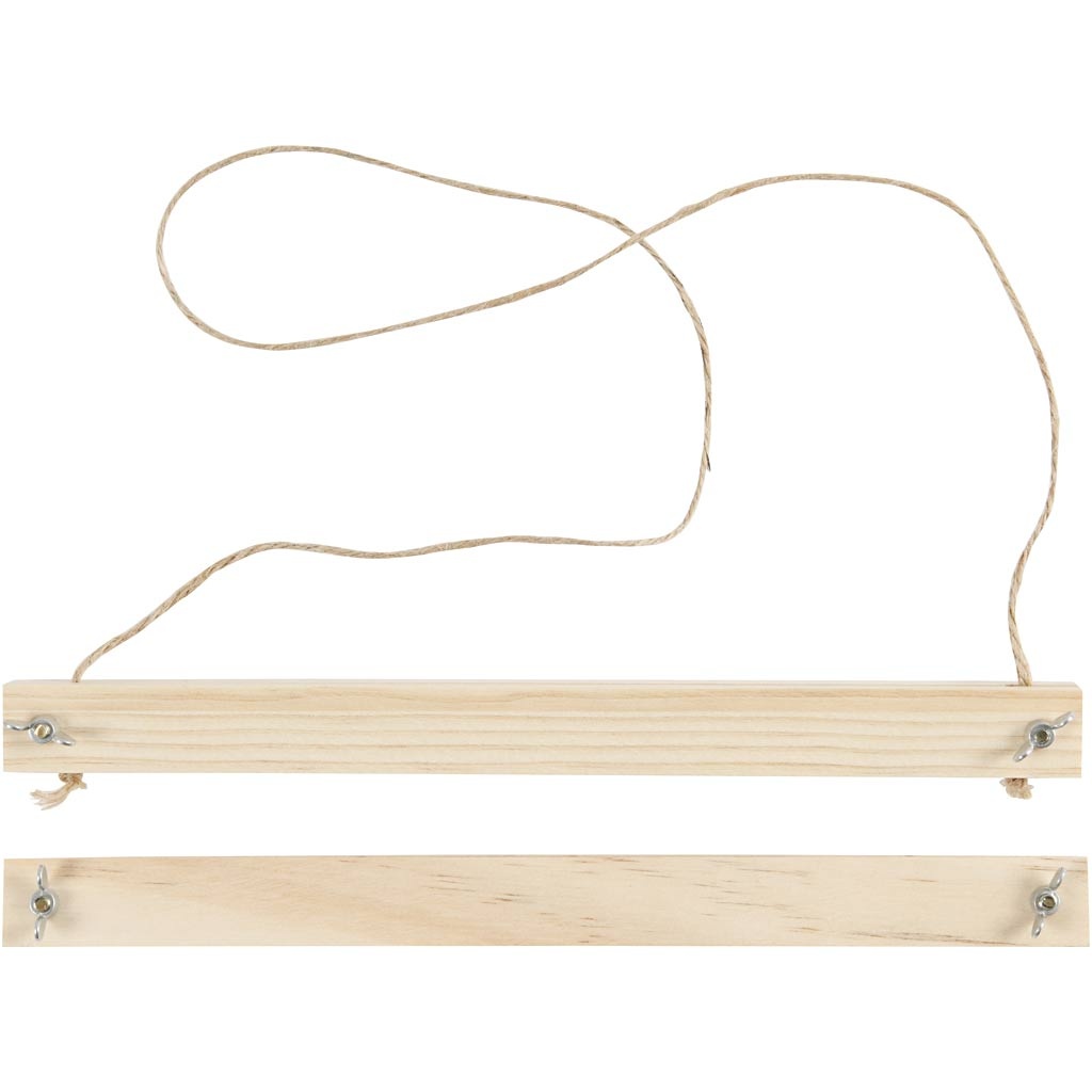 Set posterlijsten van licht hout bestaande uit 2 boven- en 2 onderlijsten, waarbij de ophanging wordt gefixeerd door middel van een vleugelmoer. Geleverd met apart ophangkoord, dat met een knoop aan de onderzijde van de bovenste strips is bevestigd
