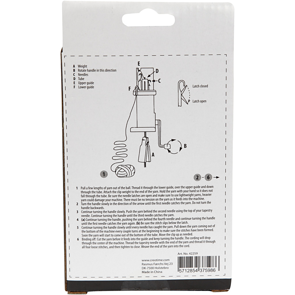 Praktische, semi-automatisch punnikgereedschap met handslinger voor eenvoudige vervaardiging van gebreide buizen. We raden 'licht' garen (Baby garen) voor haaknaald 2.5-3.5 aan. Inhoud: semi-automatische punnikmolen en geleider