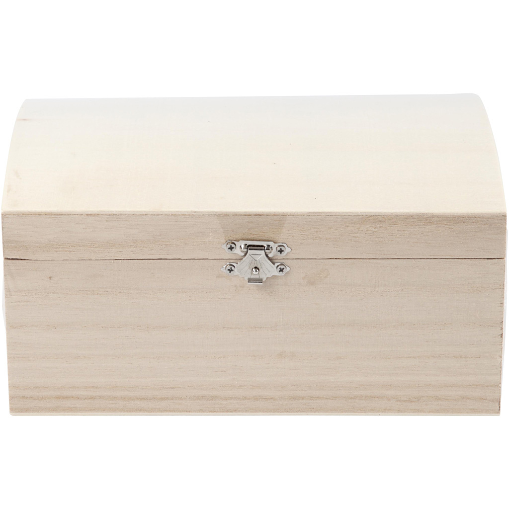 Schattige houten schatkist met rond deksel en metalen sluiting die u naar wens kunt beschilderen en versieren