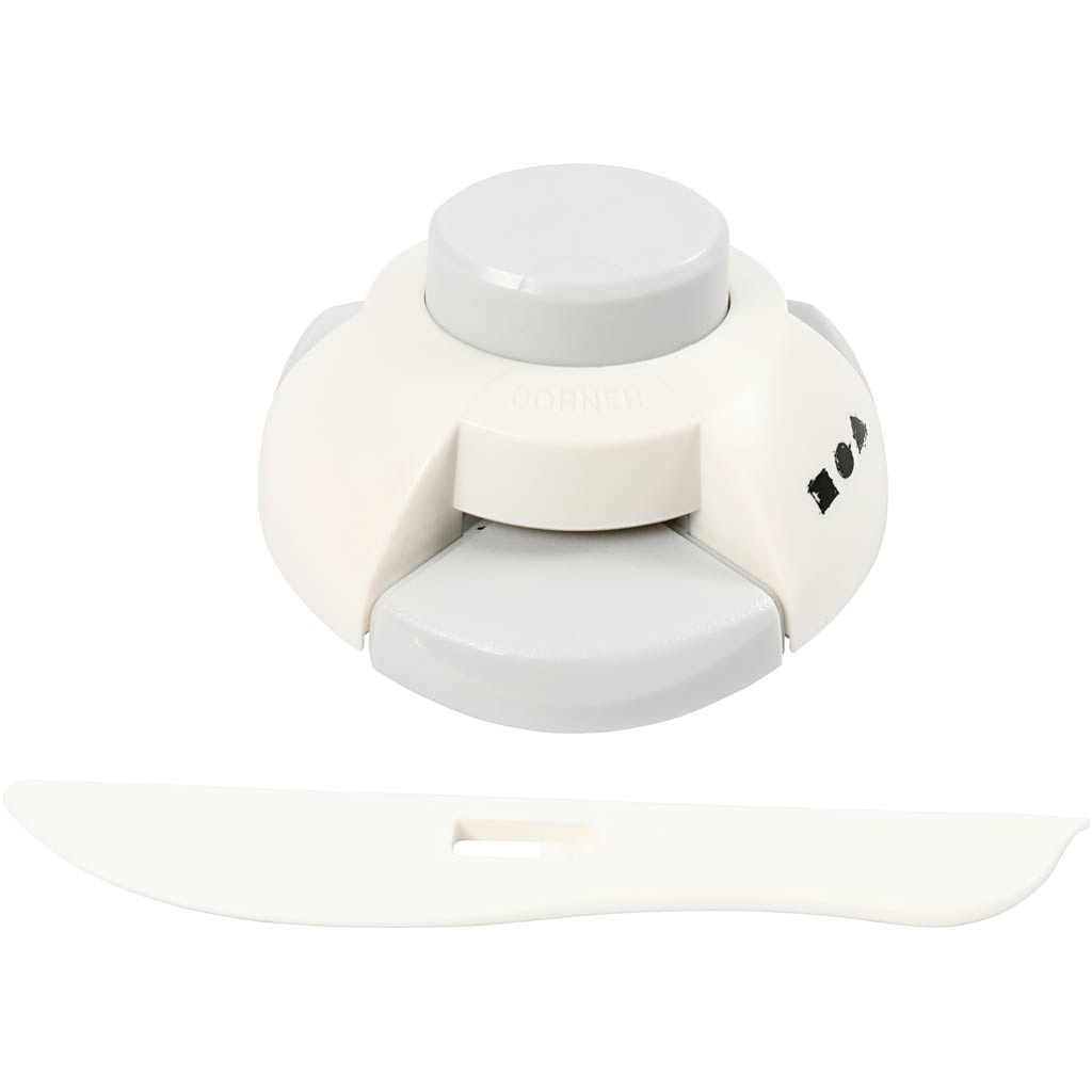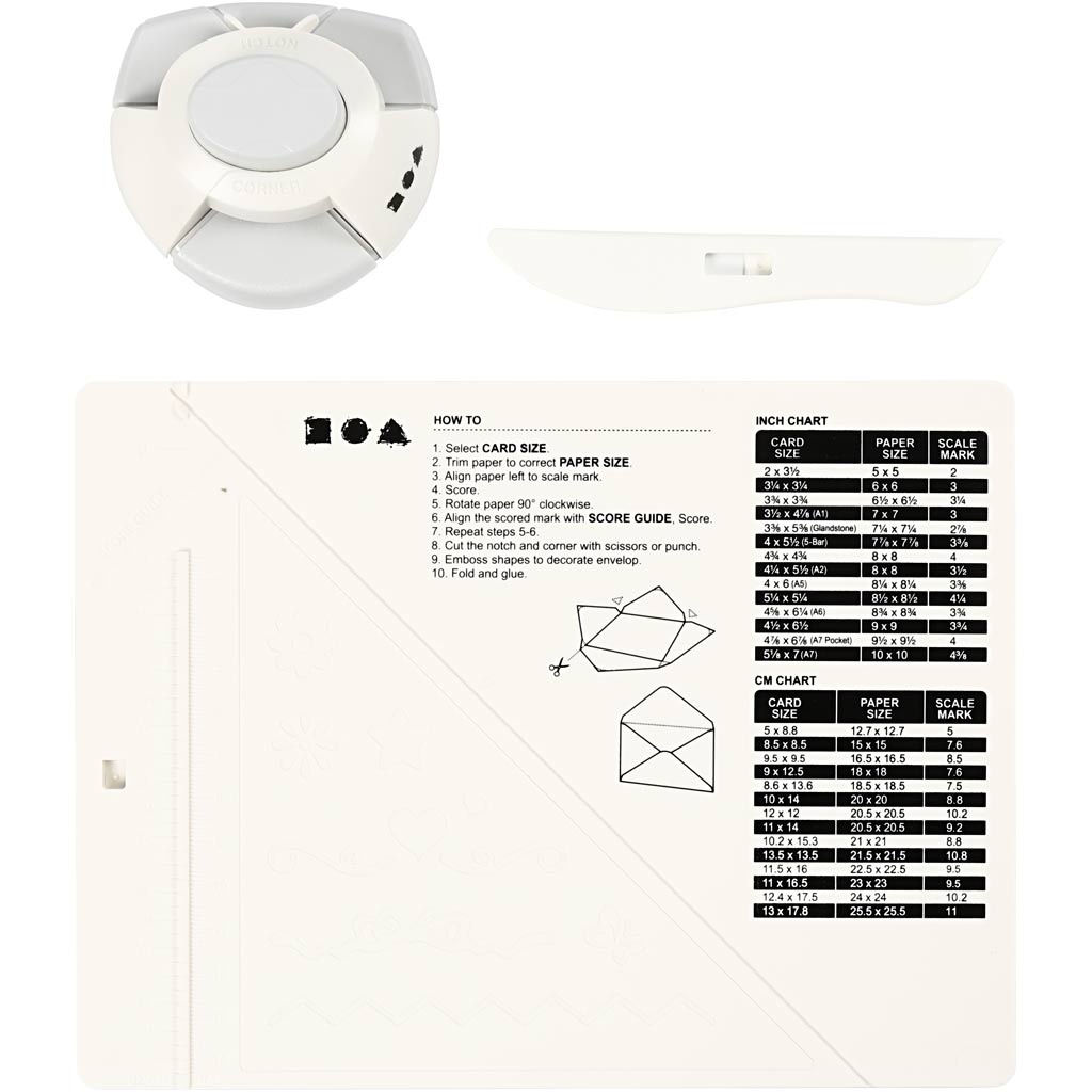 Praktisch gereedschap van kunststof met gedrukte hulplijnen voor het eenvoudig en nauwkeurig vouwen van enveloppen, dozen, kaarten enz. Inclusief ponsen voor het ponsen van hoeken en gleuven, evenals een begeleidings- en meetformulier. Geschikt voor het maken van vierkante enveloppen afm. 9x9-14x14 cm en langwerpige enveloppen 6x9.5-14.5-19 cm