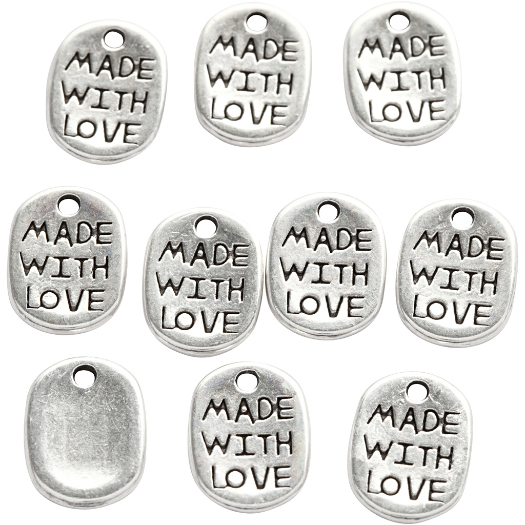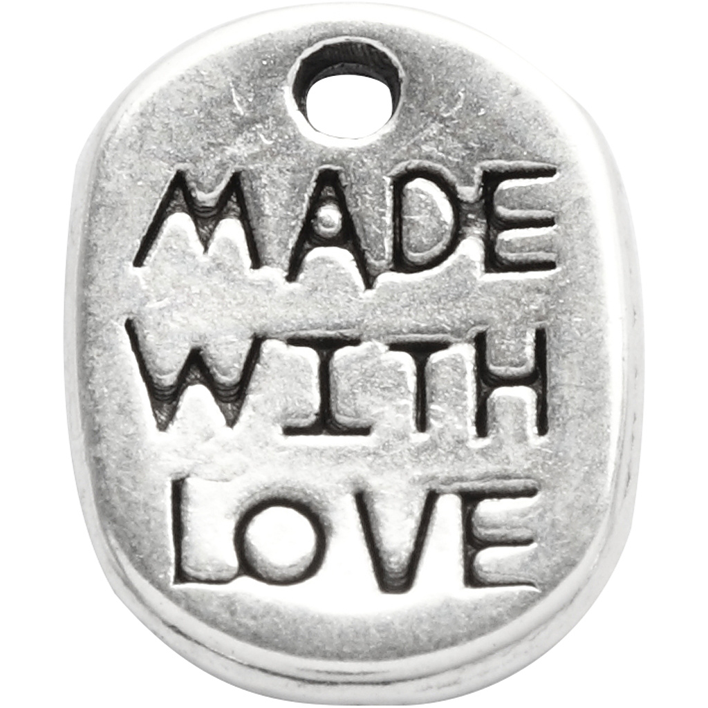 Metalen hanger in de vorm van een metalen plaatje met gaten en embossed tekst: Made with love Lees meer