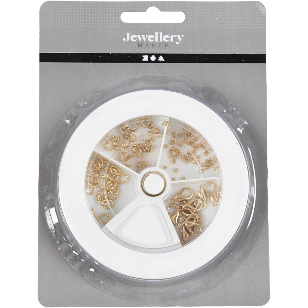 De set bevat allerlei sieradenaccessoires die u nodig hebt voor het bevestigen en sluiten van jasserons met sieradendraad of leerkoord