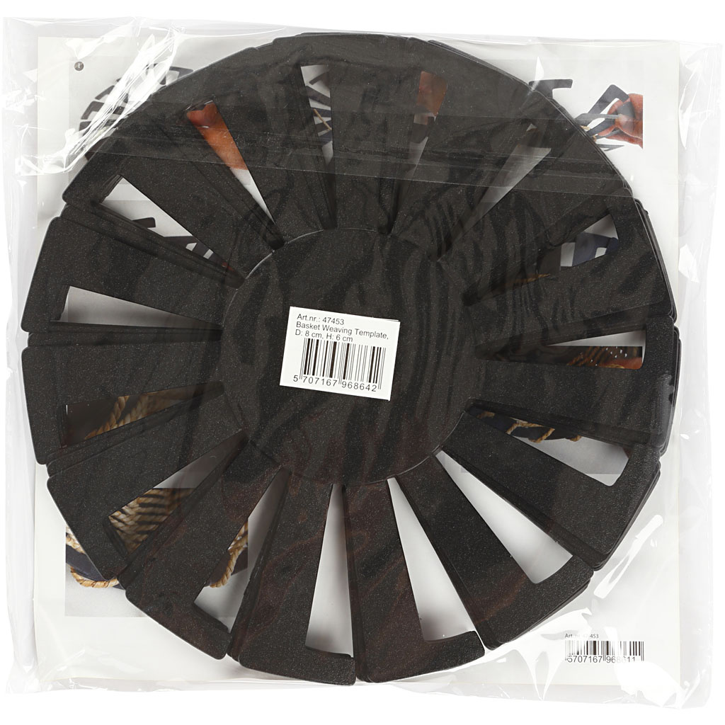 Met het Sjabloon Mand weven van Creativ Company haal je een stijlvolle basis in huis voor creatieve projecten. Deze set bestaat uit 10 zwarte sjablonen, elk met een hoogte van 6 cm en een diameter van 8 cm, verpakt in een enkele doos. De kleur zwart zorgt voor een tijdloze uitstraling en laat zich makkelijk combineren met verschillende vlechtmaterialen en decoraties.