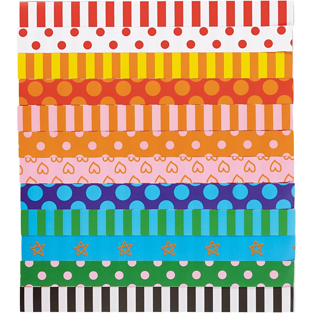 Stroken van glanspapier in heldere en sterke kleuren en een witte achterkant. Pakket bevat 12 verschillende designs