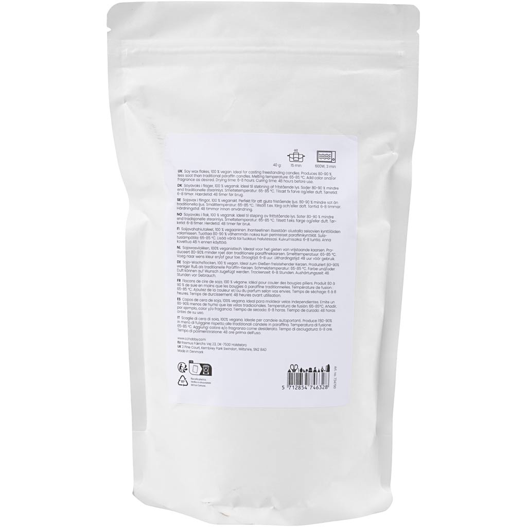 Sojawas-vlokken, 100% vegan. Perfect voor iedereen die op zoek is naar kaarsen die geen houder nodig hebben, zoals stompkaarsen en kaarsen in de vorm van een figuur. Produceert 80-90% minder roet dan traditionele kaarsen. Smelttemperatuur: 65–85 °C. Voeg bijvoorbeeld kleurstof en/of geur toe. Droogtijd: 6–8 uur. Uithardtijd: 48 uur voor gebruik
