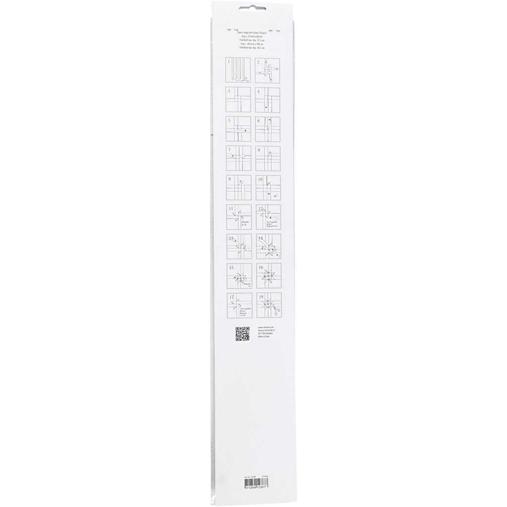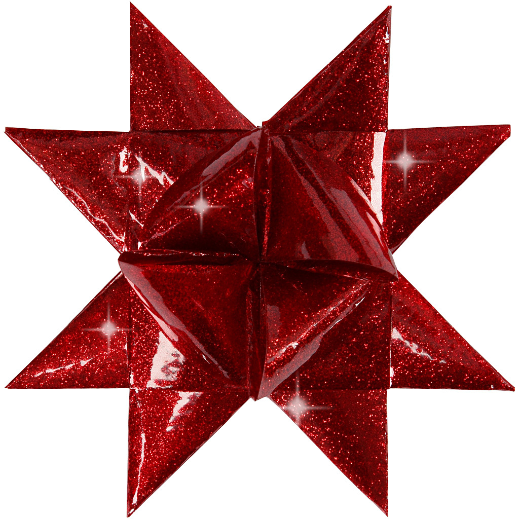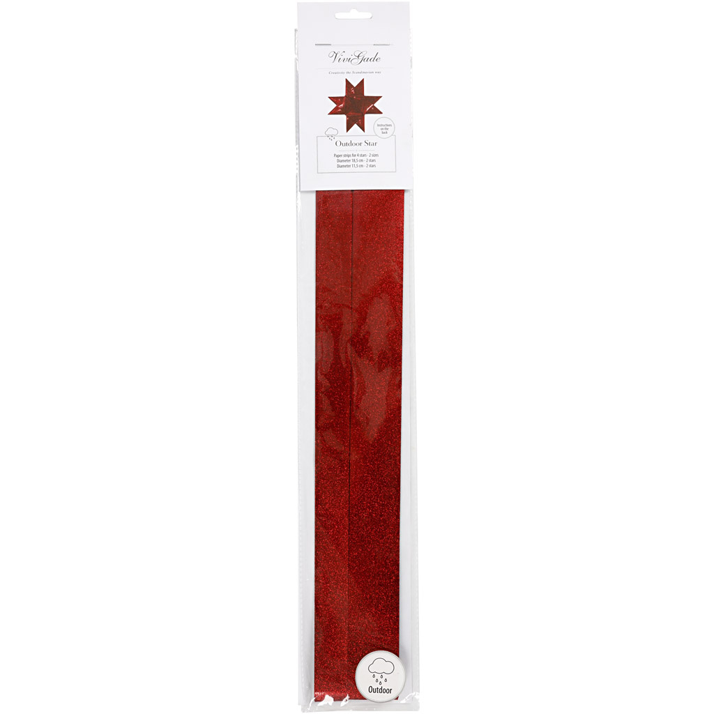 Glitterfolie stroken voor het vlechten van sterren in een design van Vivi Gade. De folie is weersbestendig, zodat de sterren buiten kunnen hangen. Diameter geeft de maat van de kant-en-klare ster aan. Inclusief instructies. Set met 16 stroken voor 4 sterren in 2 maten. Einden kunnen worden vastgezet met glue dots, tape of lijm.