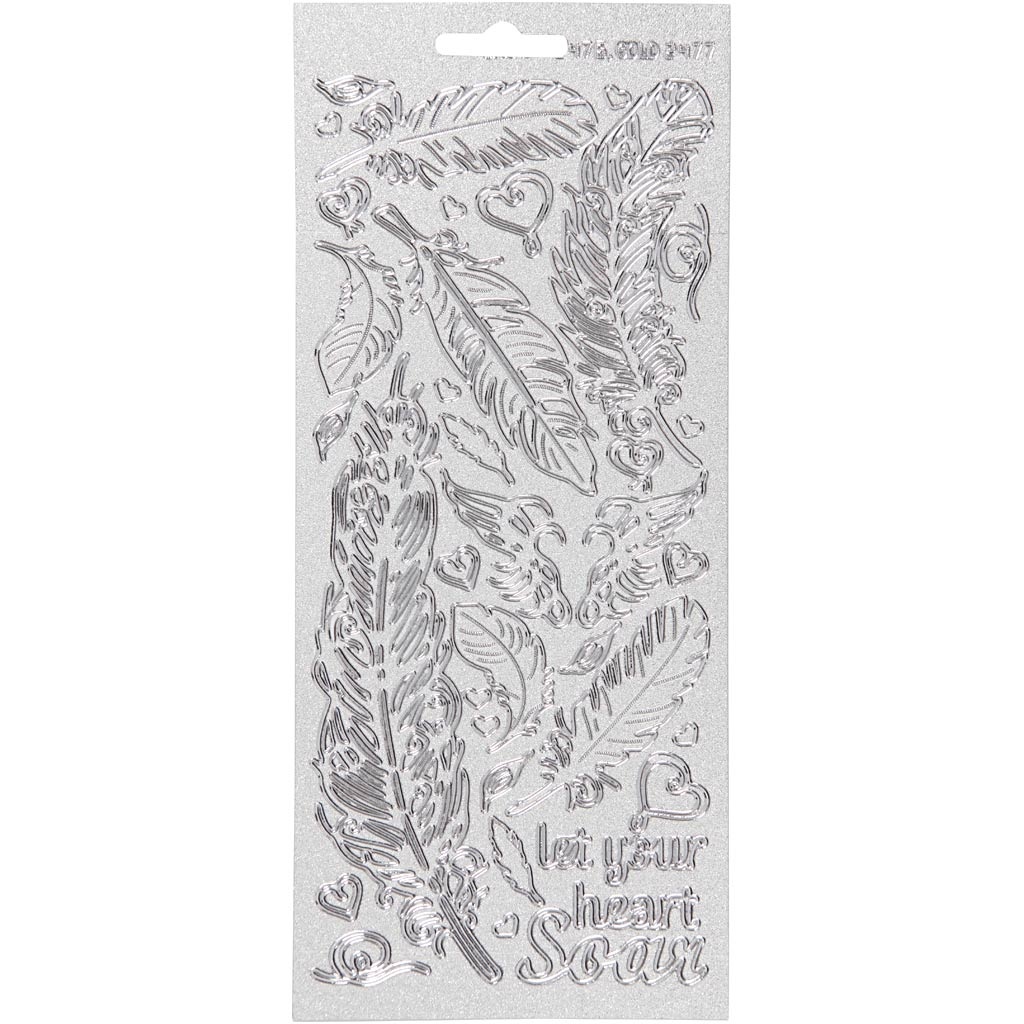 De Creativ Company stickers met verenmotief zijn een stijlvolle toevoeging aan elk creatief project. Het vel meet 10 bij 23 centimeter en is uitgevoerd in elegant zilver op papier, waardoor de stickers gemakkelijk te verwerken zijn. Ze zijn ideaal voor het versieren van kaarten, notitieboeken of cadeaus en geven elk kunstwerk een subtiele, glanzende uitstraling.