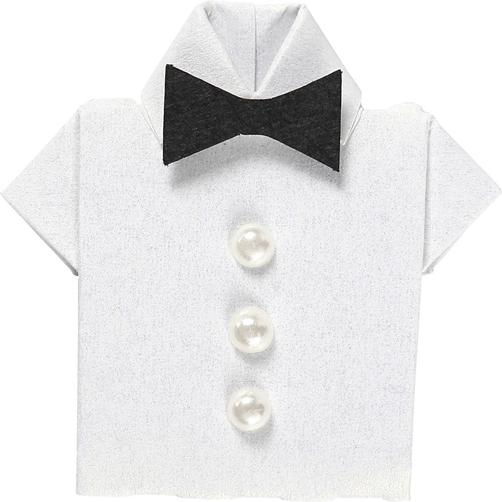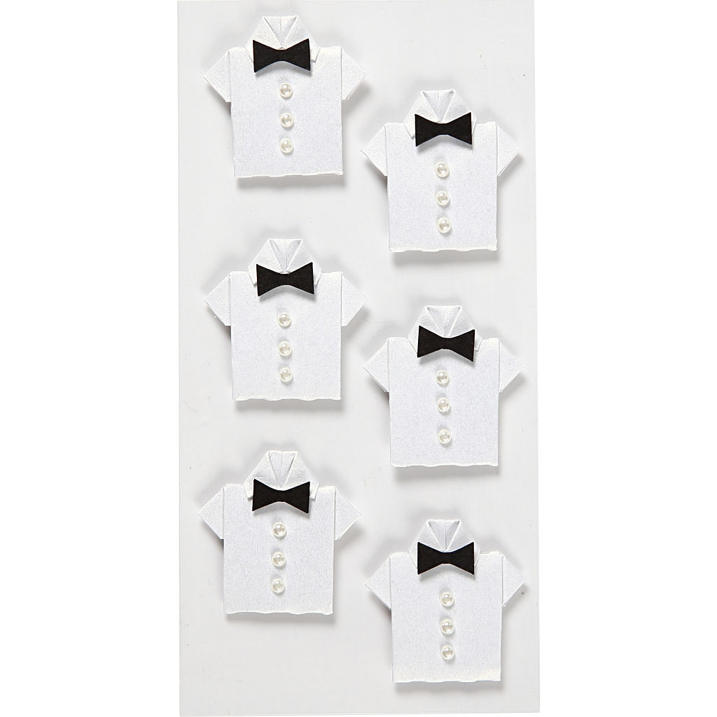 Stickers in de vorm van een overhemd met zelfklevende pad aan de achterkant voor een 3D effect. Het overhemd is in origami gevouwen met extra fijne details van wit papier en parelmoer, een zwart vlinderdasje en knopen van kleine strasstenen Lees meer